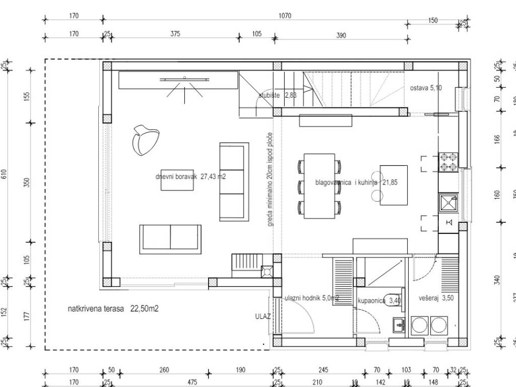 On the ground floor there is an open space kitchen, dining room and living room from which you can directly access the covered terrace of 22.5 m2.