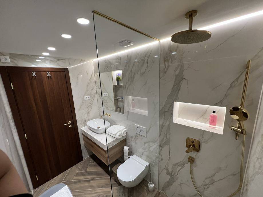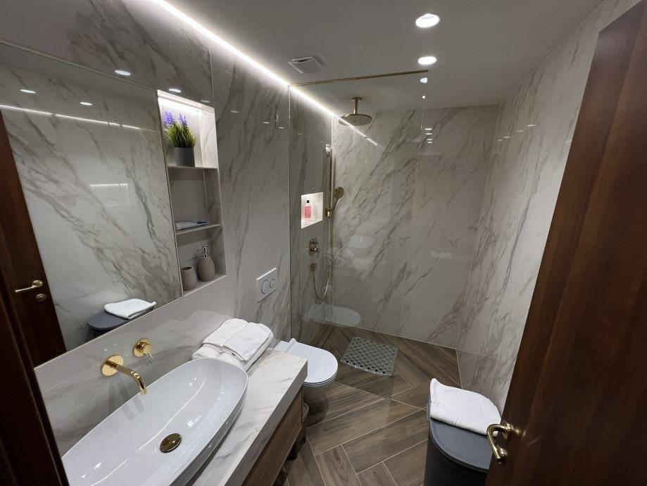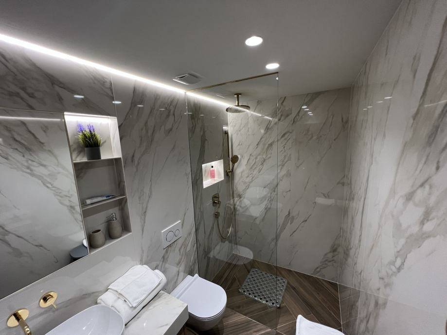 - hidden shower channel, double tempered glass shower, illuminated wall niches