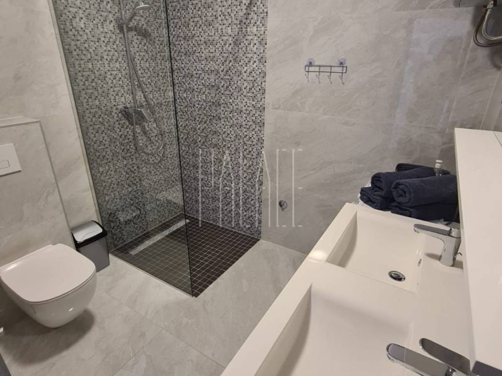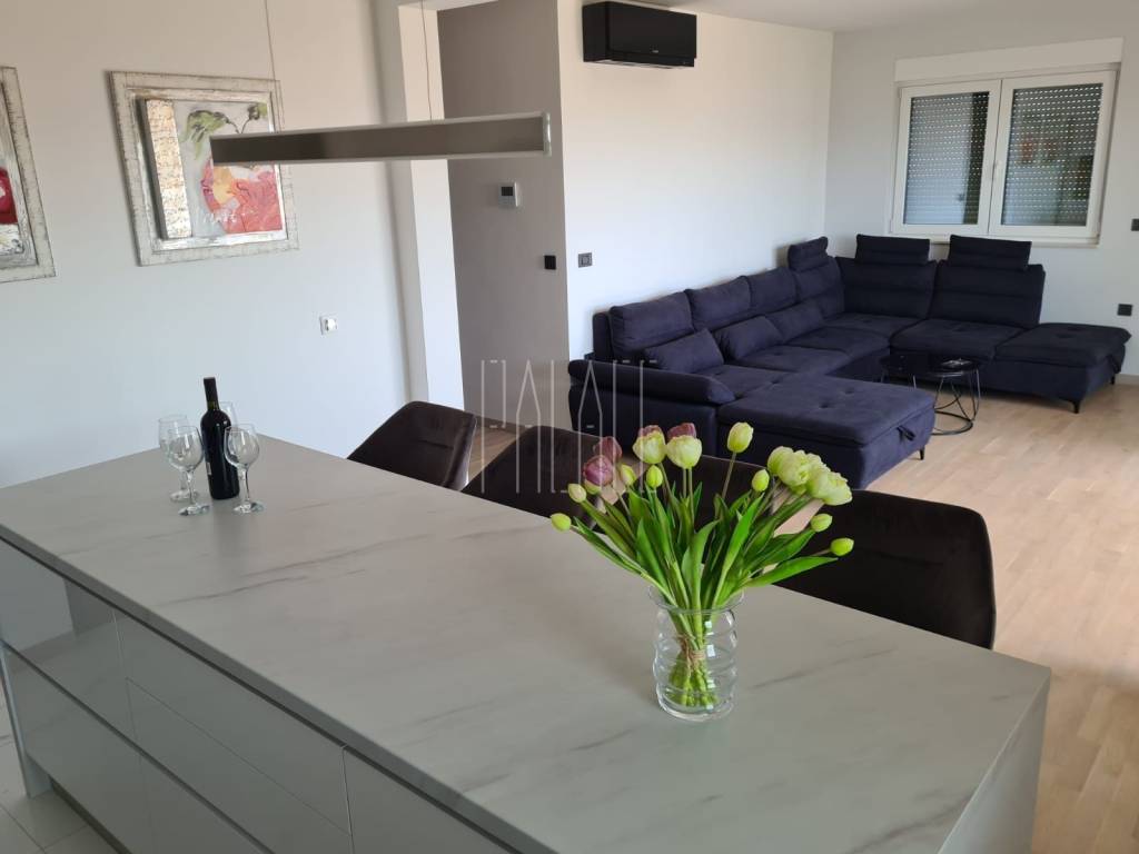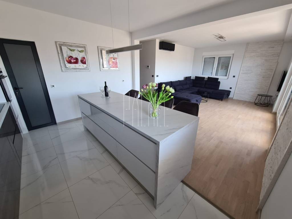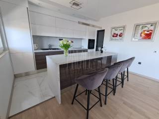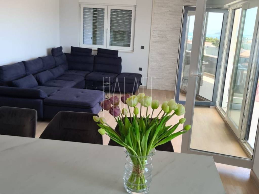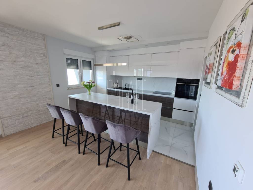 We mediate in the sale of a luxury penthouse with a panoramic view of the sea. It is located on the last floor of a smaller residential building. The building has a communal pool. The building has an A+ energy certificate. The penthouse has a total living area of 83.19mm² , and consists of a kitchen with a dining room and a large living room, three bedrooms, two bathrooms, an entrance hall, a storage room and a large loggia of 21.12m² . It has one outdoor parking space, which is included in the price of the apartment, and a 5m² storage room in the basement of the building. The penthouse is luxuriously decorated and is sold unfurnished but it possible to buy with furniture.