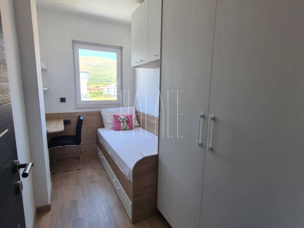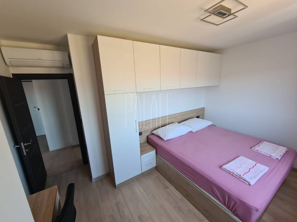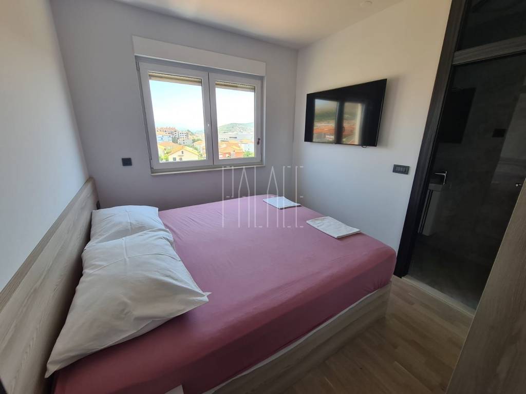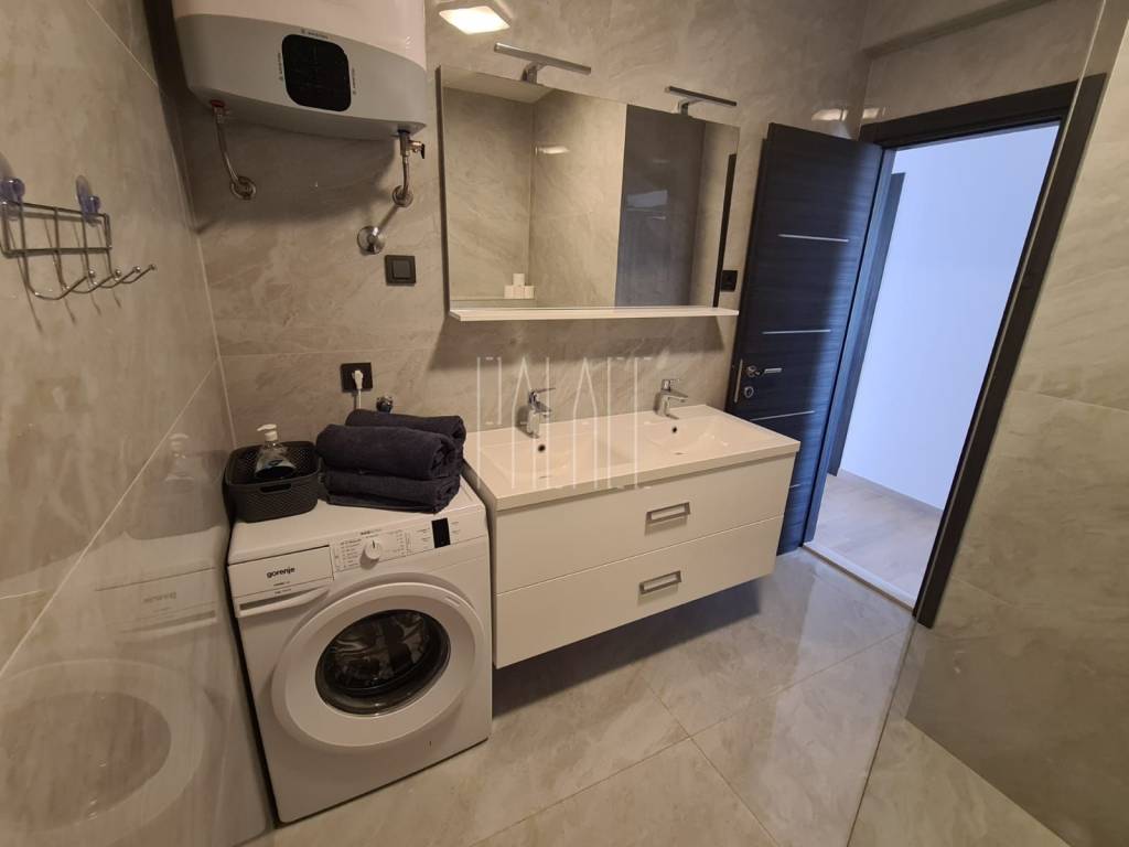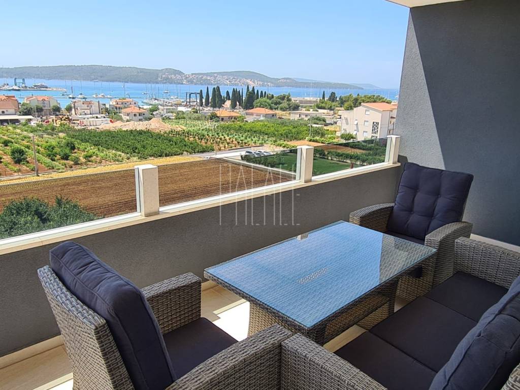 We mediate in the sale of a luxury penthouse with a panoramic view of the sea. It is located on the last floor of a smaller residential building. The building has a communal pool. The building has an A+ energy certificate. The penthouse has a total living area of 83.19mm² , and consists of a kitchen with a dining room and a large living room, three bedrooms, two bathrooms, an entrance hall, a storage room and a large loggia of 21.12m² . It has one outdoor parking space, which is included in the price of the apartment, and a 5m² storage room in the basement of the building. The penthouse is luxuriously decorated and is sold unfurnished but it possible to buy with furniture.