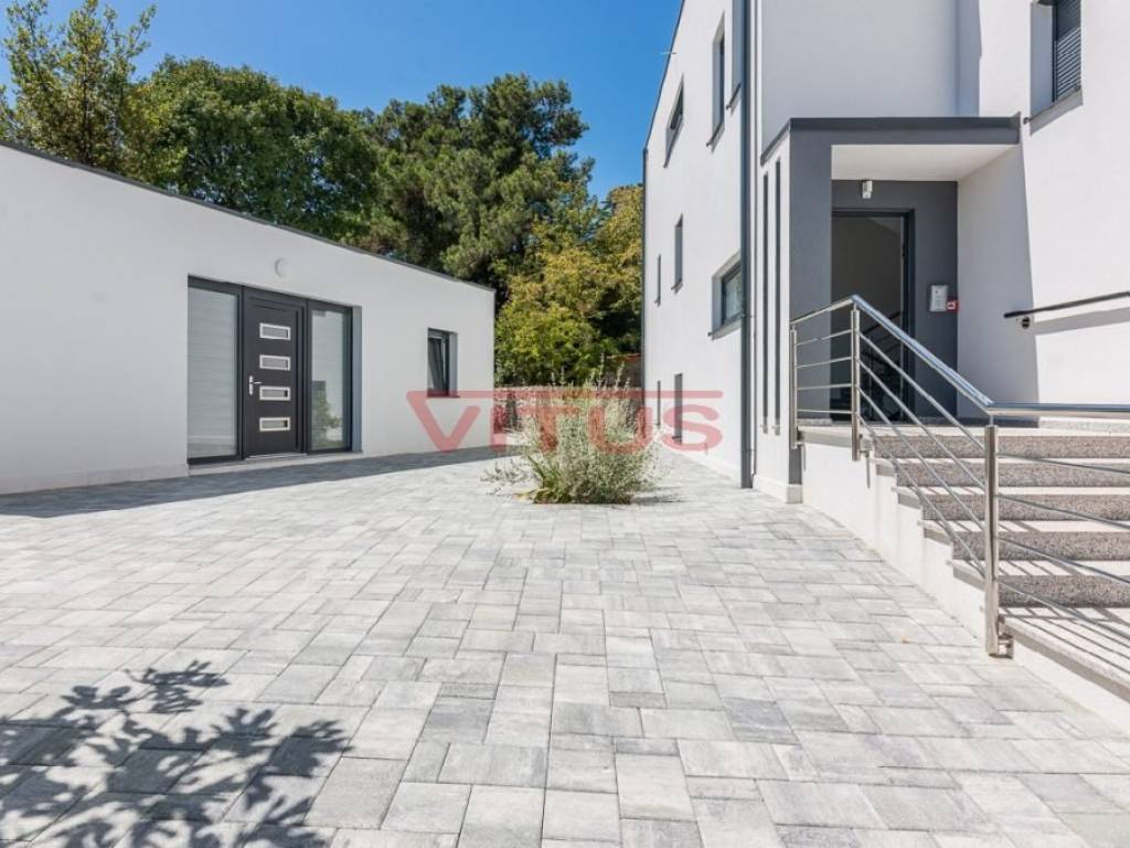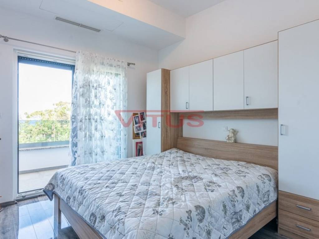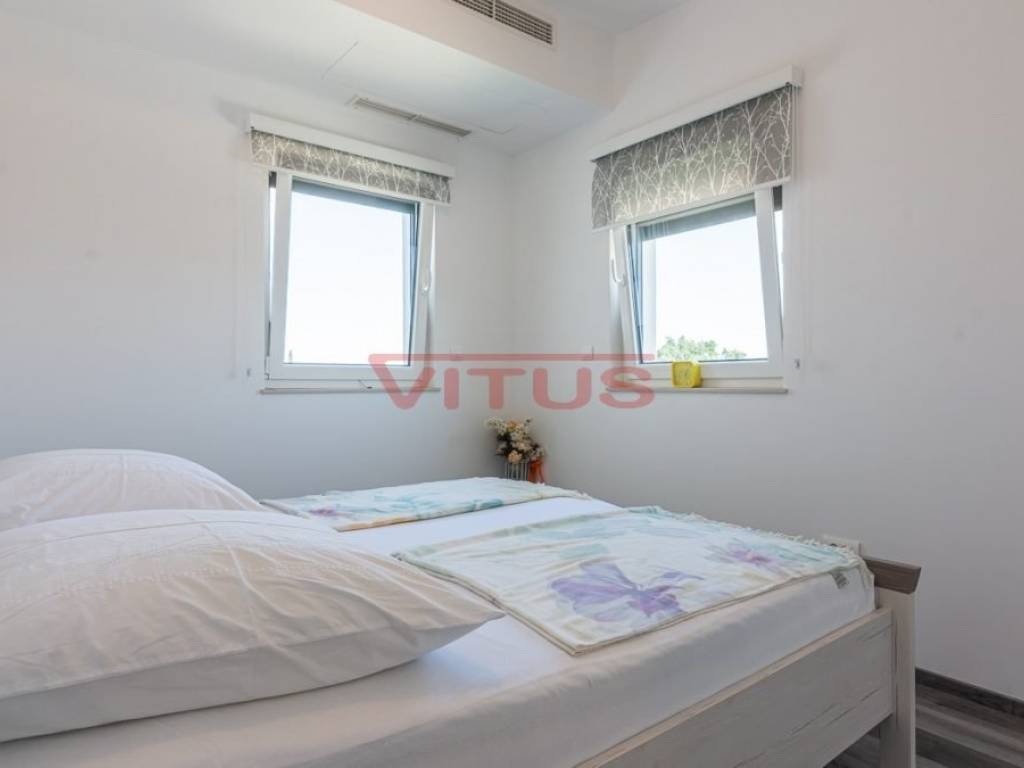 The exclusive penthouse is located on the second floor of a modern building in Malinska.The living space is 147 m2 and consists of a kitchen with a dining area and a living room, three bedrooms, a wardrobe, a bathroom, a toilet and a storage room.The living room has an access to a large covered terrace with a sea view.Two bedrooms have their own covered terraces with sea views.