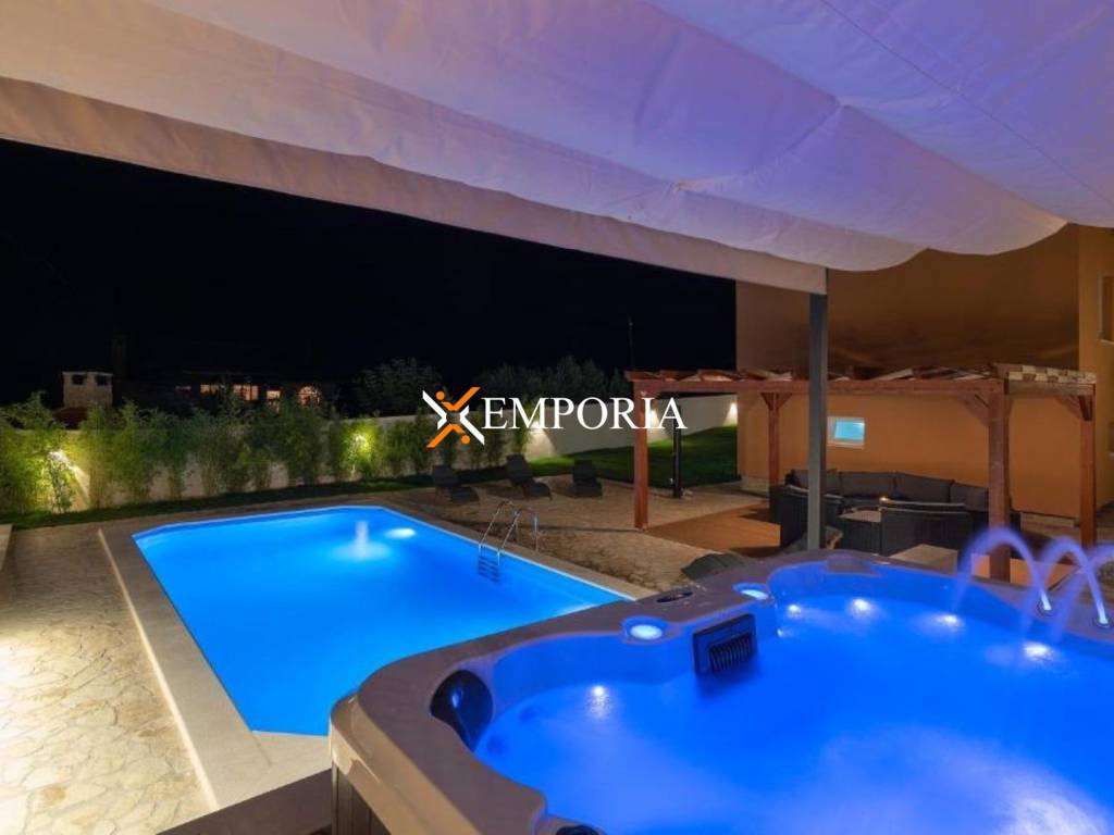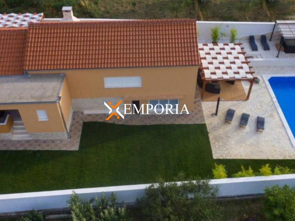 A beautiful house with a large garden is for sale in Debeljak near Sukošan. The yard is equipped with swimming pool, jacuzzi, pergola and barbecue.