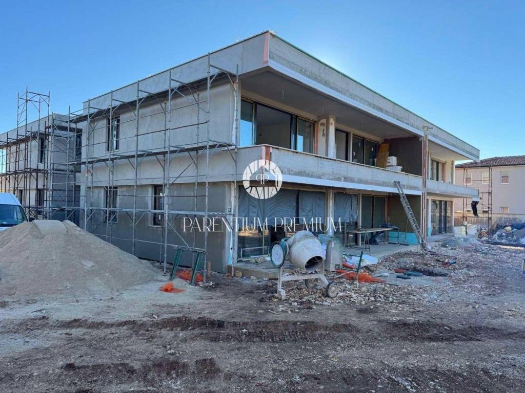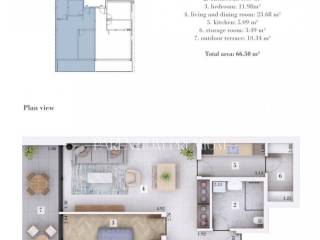 A modern and high-quality ground-floor apartment for sale, located just a few minutes drive from Rovinj. The apartment is situated on the ground floor and includes a 30 m private yard in front of the terrace, ideal for outdoor relaxation. The total area of the apartment is 66.50 m, consisting of a hallway (6.23 m), bathroom (5.69 m), bedroom (11.98 m), living and dining room (23.68 m), kitchen (5.09 m), storage room (3.49 m) and a covered outdoor terrace of 10.34 m.