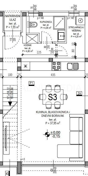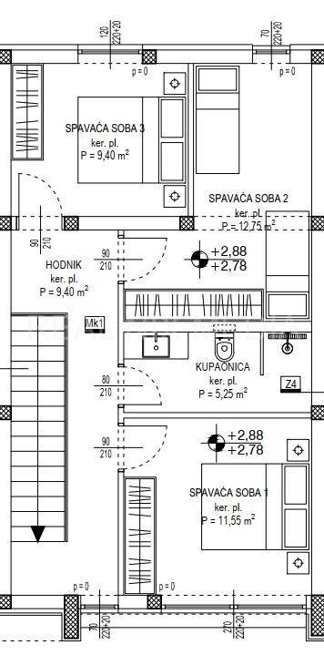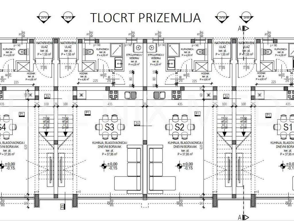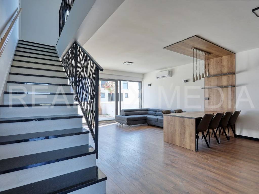 S4 - u prizemlju se nalazi natkriveni ulaz, hodnik, kupaonica, vešeraj, kuhinja, blagovaonica i dnevni boravak sa izlazom na VRT (95,00 m2). Na katu kuće smještene su tri spavaće sobe i kupaonica. U dvorištu kuće nalaze se dva vanjska parkirna mjesta. Cijena: 380.568,00 EUR-a.