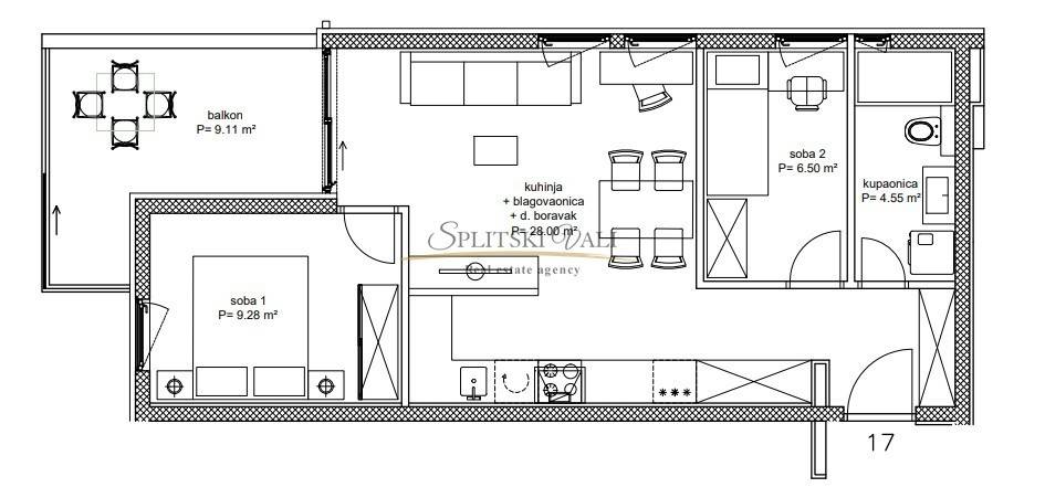 Stan se sastoji od dnevnog boravka s kuhinjom i blagovaonicom, dvije spavaće sobe, kupaonice i balkona površine 9,11 m. Ukupna obračunska površina iznosi 52,89 m. Tlocrt i detaljna specifikacija nalaze se u slikama oglasa.