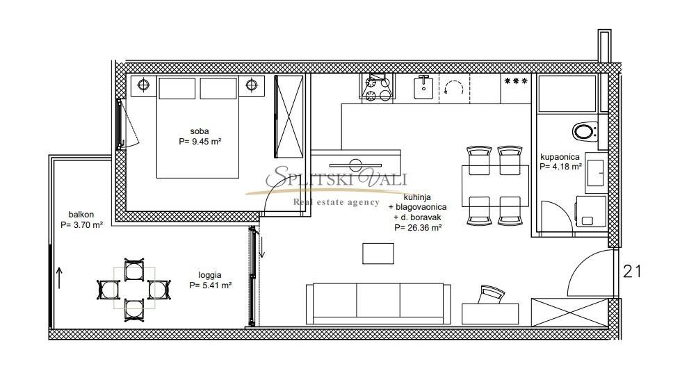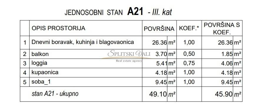 Stan se sastoji od dnevnog boravka s kuhinjom i blagovaonicom, spavaće sobe, kupaonice, loggie i balkona površine 3,70 m. Ukupna obračunska površina iznosi 45,90 m. Tlocrt i detaljna specifikacija nalaze se u slikama oglasa.