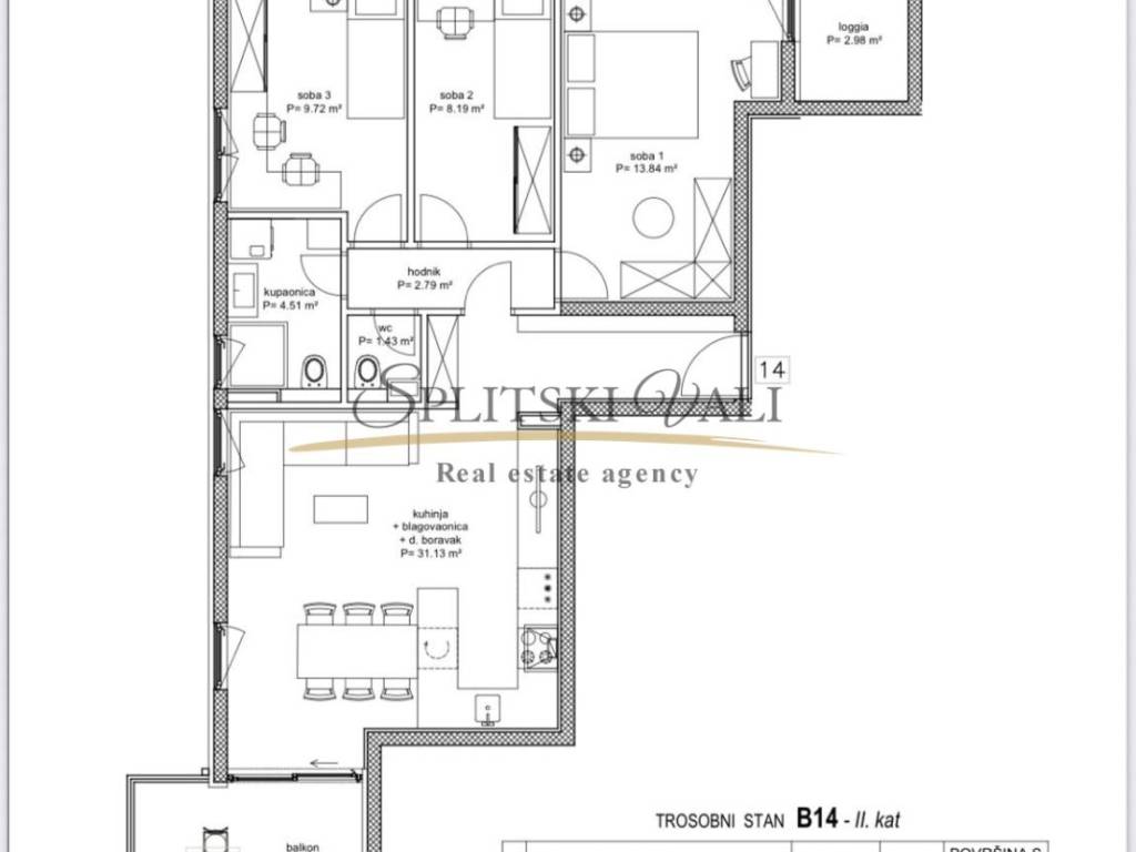 Stan se sastoji od dnevnog boravka s kuhinjom i blagovaonicom, tri spavaće sobe, kupaonice, dodatnog WC-a, hodnika, loggie i balkona površine 10,05 m. Ukupna obračunska površina iznosi 78,88 m. Tlocrt i detaljna specifikacija nalaze se u slikama oglasa.