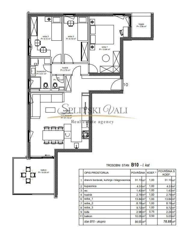 Stan se sastoji od dnevnog boravka s kuhinjom i blagovaonicom, tri spavaće sobe, kupaonice, dodatnog WC-a, hodnika, loggie i balkona površine 10,05 m. Ukupna obračunska površina iznosi 78,88 m. Tlocrt i detaljna specifikacija nalaze se u slikama oglasa.