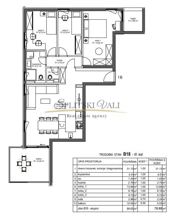Stan se sastoji od dnevnog boravka s kuhinjom i blagovaonicom, tri spavaće sobe, kupaonice, dodatnog WC-a, hodnika, loggie i balkona površine 10,05 m. Ukupna obračunska površina iznosi 78,88 m. Tlocrt i detaljna specifikacija nalaze se u slikama oglasa.