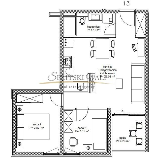 Stan se sastoji od dnevnog boravka s kuhinjom i blagovaonicom, dvije spavaće sobe, kupaonice i loggie površine 4,23 m. Ukupna obračunska površina iznosi 49,19 m. Tlocrt i detaljna specifikacija nalaze se u slikama oglasa.