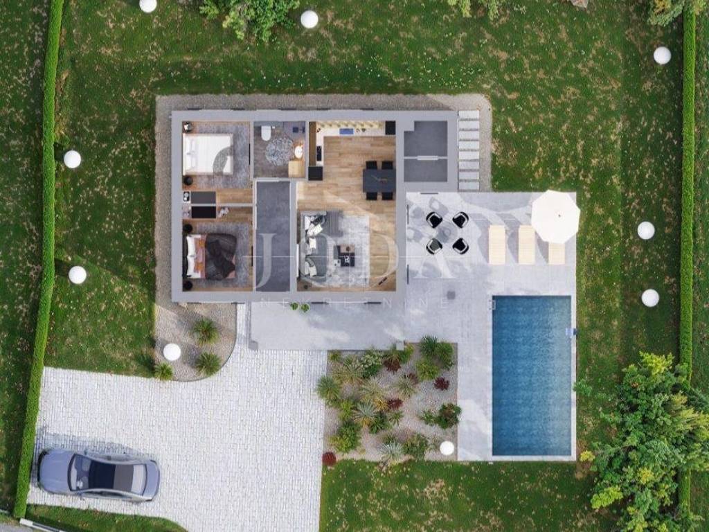 Info 00385 98 592122 Roberta BARBAN area A house for sale in the unfinished phase with a swimming pool - a quiet location, ideal for vacation and family life. The total living area includes: a living room and an open-plan kitchen, two bedrooms, a toilet, a bathroom and a storage room. Covered and uncovered terraces and a swimming pool. The terrace and swimming pool are oriented towards nature and greenery. The house is sold in the unfinished phase, and offers the buyer the opportunity to complete the interior according to their own wishes. Along with the ad of a photo visualization of the house and interior, the price refers to the unfinished phase. The completion of the house in accordance with the agreement with the potential buyer.