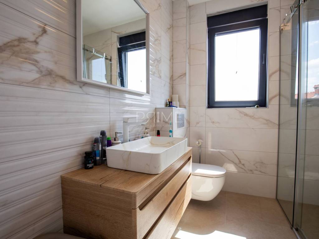 Nudimo na prodaju moderno uređen penthouse površine 97,78 m2 smješten u novogradnji visokog standarda, u manjoj stambenoj zgradi s ukupno šest jedinica. Stan se nalazi na drugom katu i sastoji se od dvije spavaće sobe, kupaonice, zasebnog WC-a, prostrane kuhinje s blagovaonicom te dnevnog boravka.