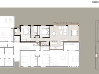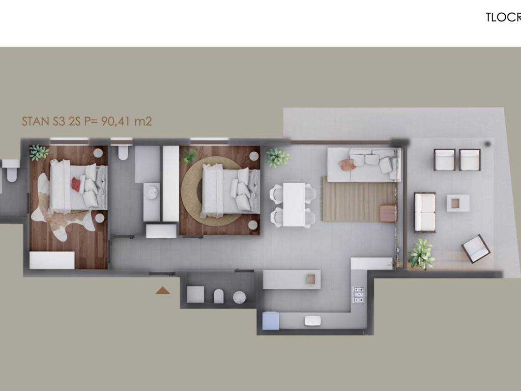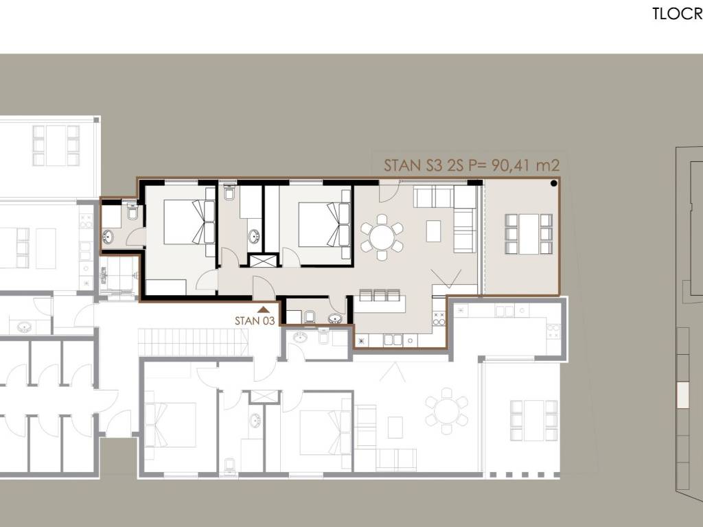 Stan S3 – prizemlje, ukupne površine 90,41 m², sastoji se od:hodnika, dvije kupaonice, wc-a, dvijespavaće sobe, prostranog dnevnog boravka s kuhinjom i blagovaonicom u otvorenom konceptu, natkrivene terase i vrta