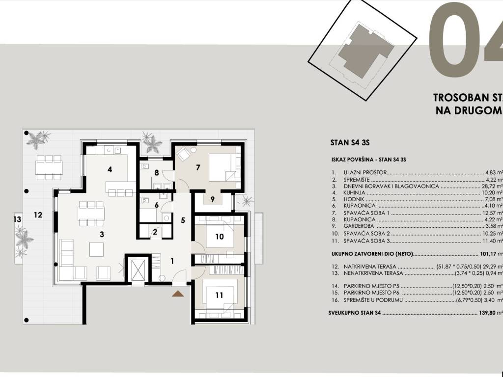 S3 – 77,20 m², dvije spavaće sobe, cijena 285.000 EUR.
