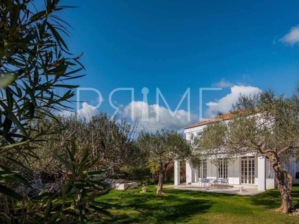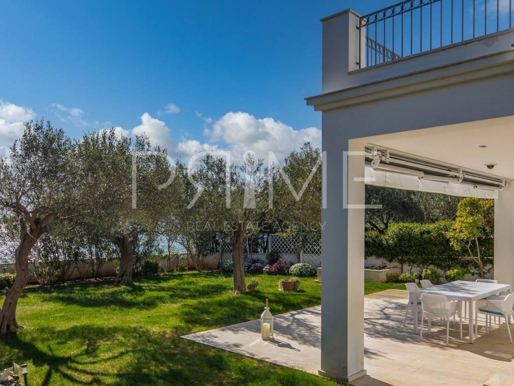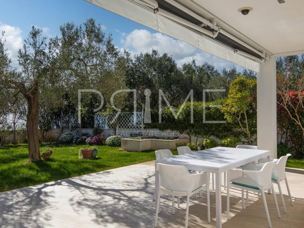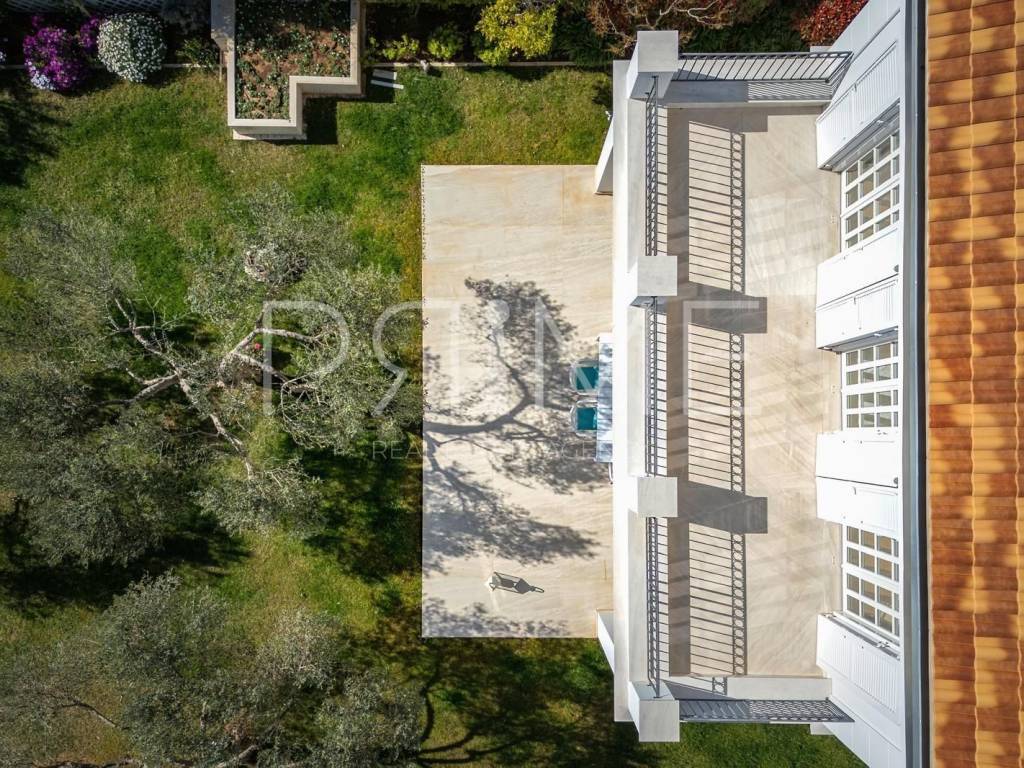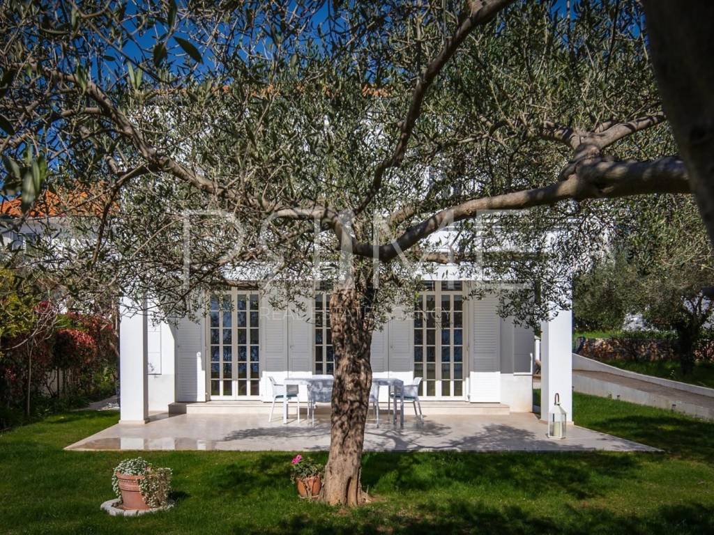 Pažljivo uređena parcela površine približno 600 m² obuhvaća njegovan travnjak, stare masline i natkrivenu terasu s tendom, savršenu za boravak na otvorenom tijekom cijelog dana. Glavna terasa idealna je za objedovanje na otvorenom, dok prostrana terasa na katu nudi savršene uvjete za sunčanje i uživanje u večerima uz zalazak sunca i pogled na more.