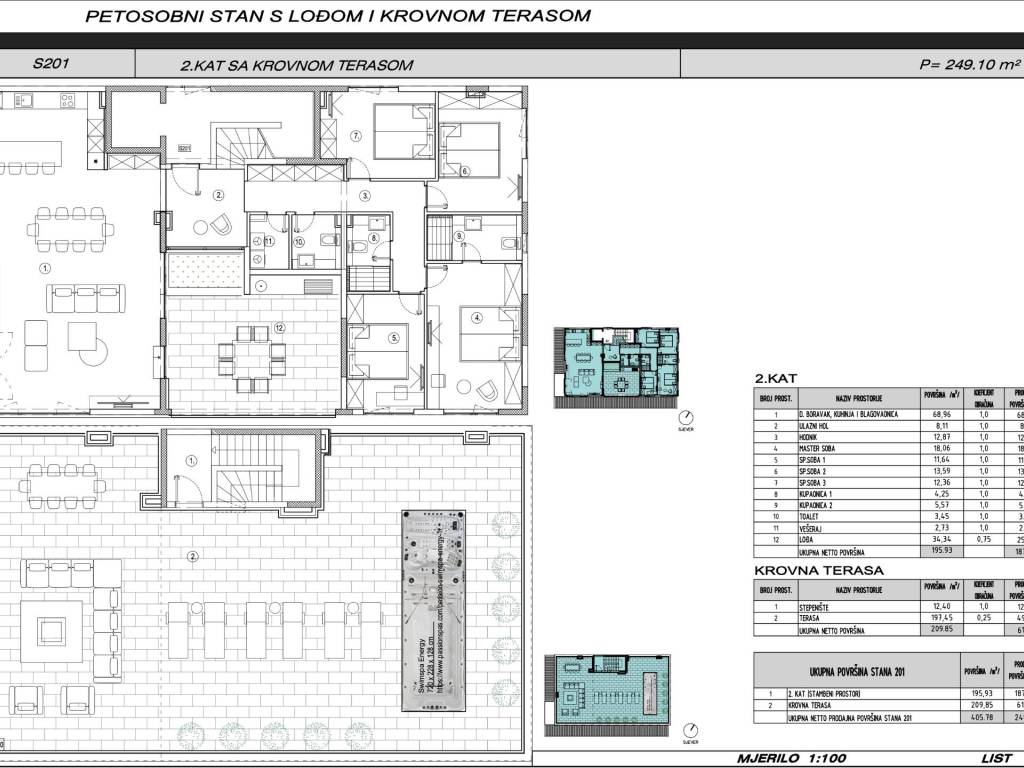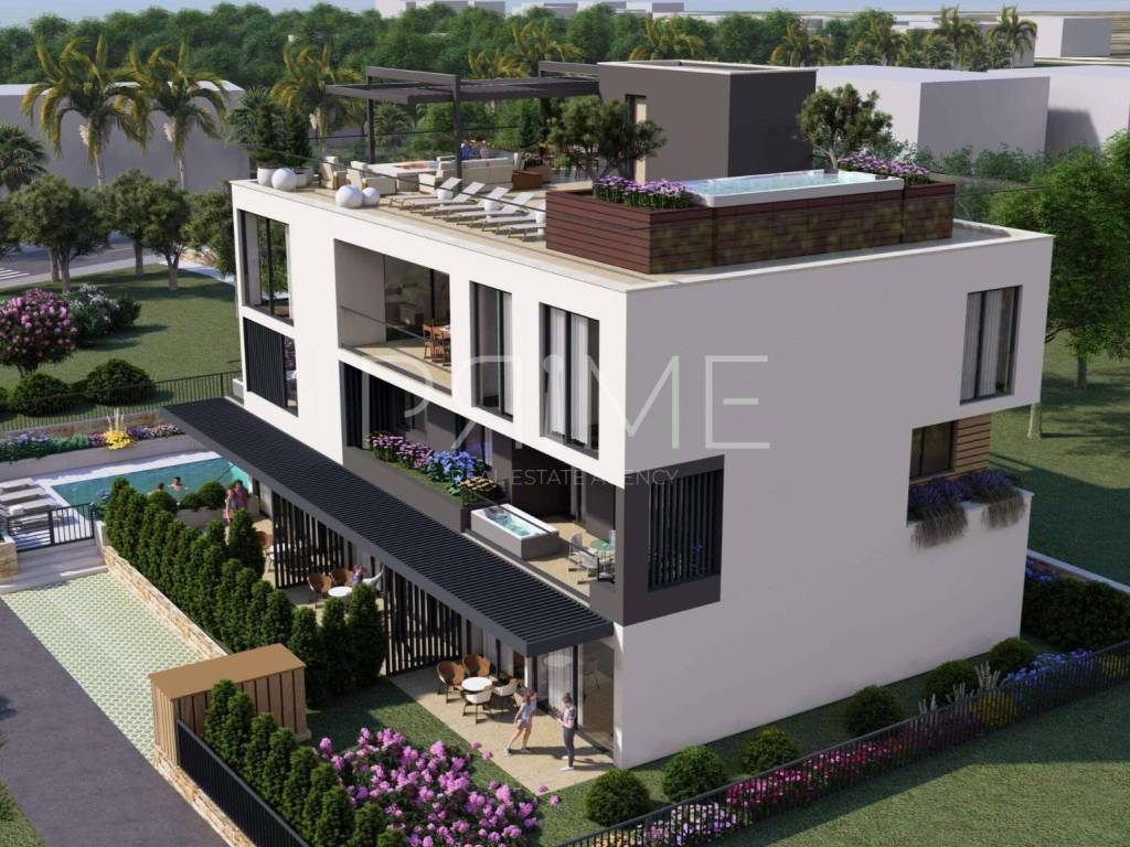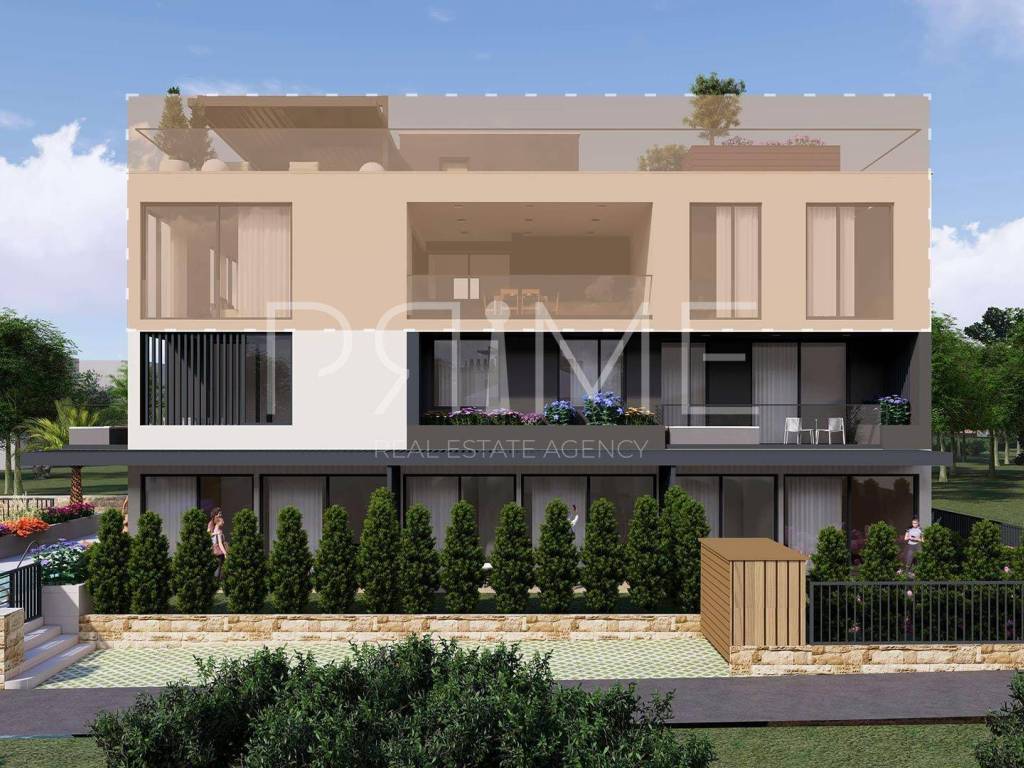 Penthouse površine 249 m2 nalazi se na drugom katu manje stambene zgrade a sastoji se od kuhinje, blagovaone, dnevnog boravka, dvije kupaonice, wc-a, četiri spavaće sobe, lođe i krovne terase. Tlocrtna površina stana je 405 m2. U izgradnji i opremanju se koriste isključivo najkvalitetniji materijali od renomiranih proizvođača. Zgrada ima lift. Iz stana se pruža panoramski pogled na more. Udaljenost od mora je 50 metara a od uređene plaže 100 metara. Završetak svih radova i useljenje se očekuje najkasnije do 01.12.2025 godine. Kupcu se na izbor ostavlja kupovina parkirnog mjesta u garaži i spremišta u podrumu zgrade.