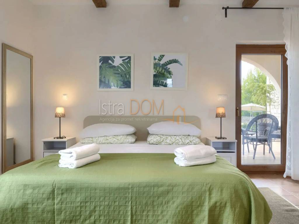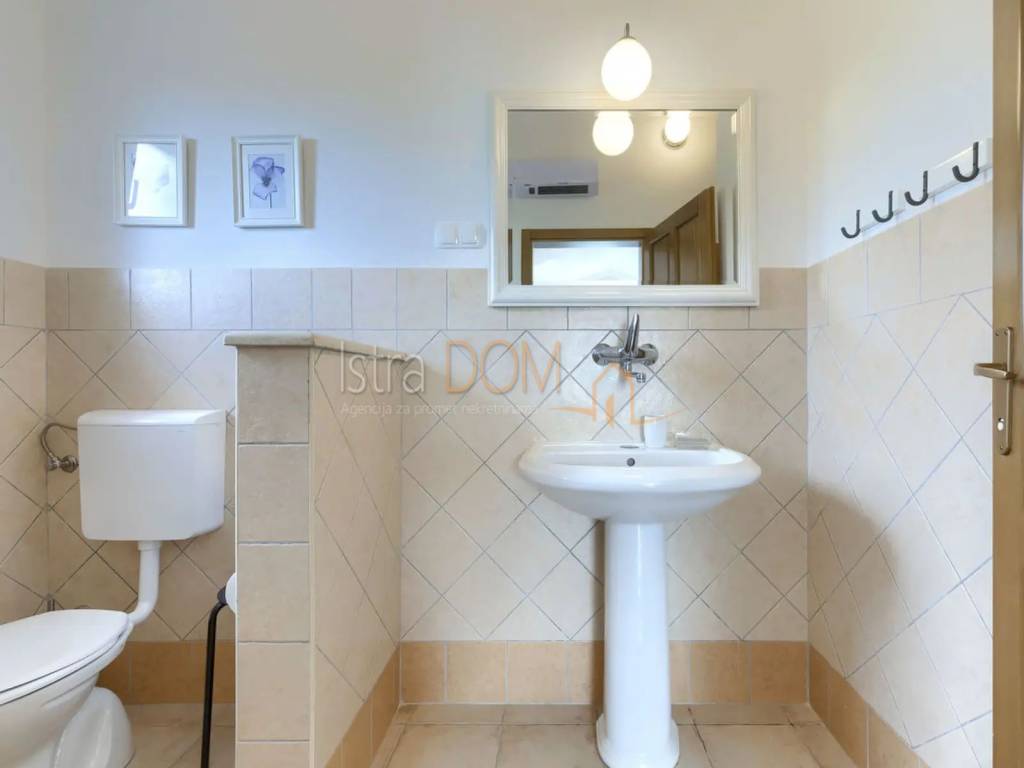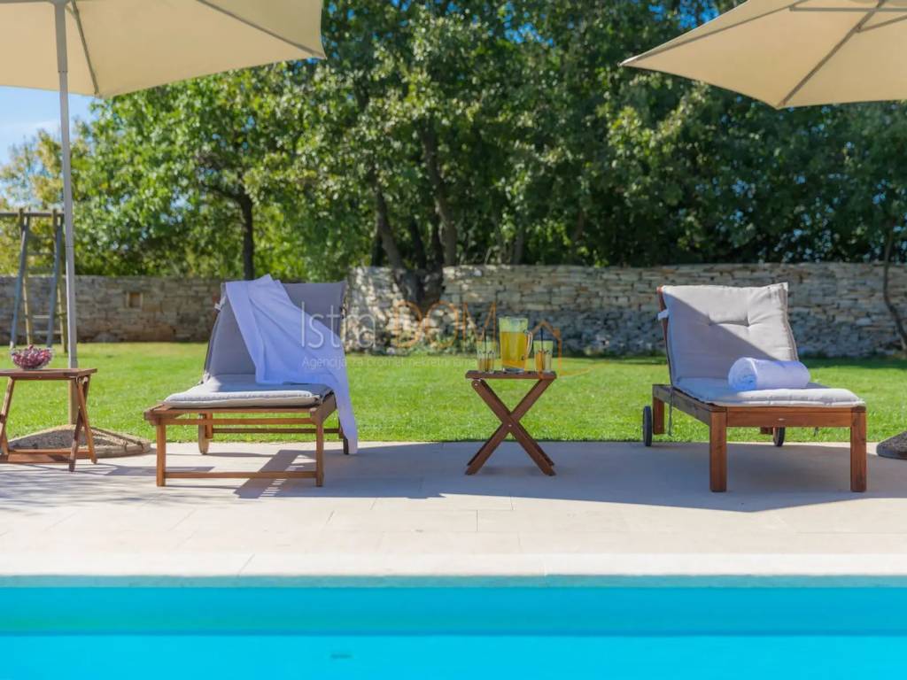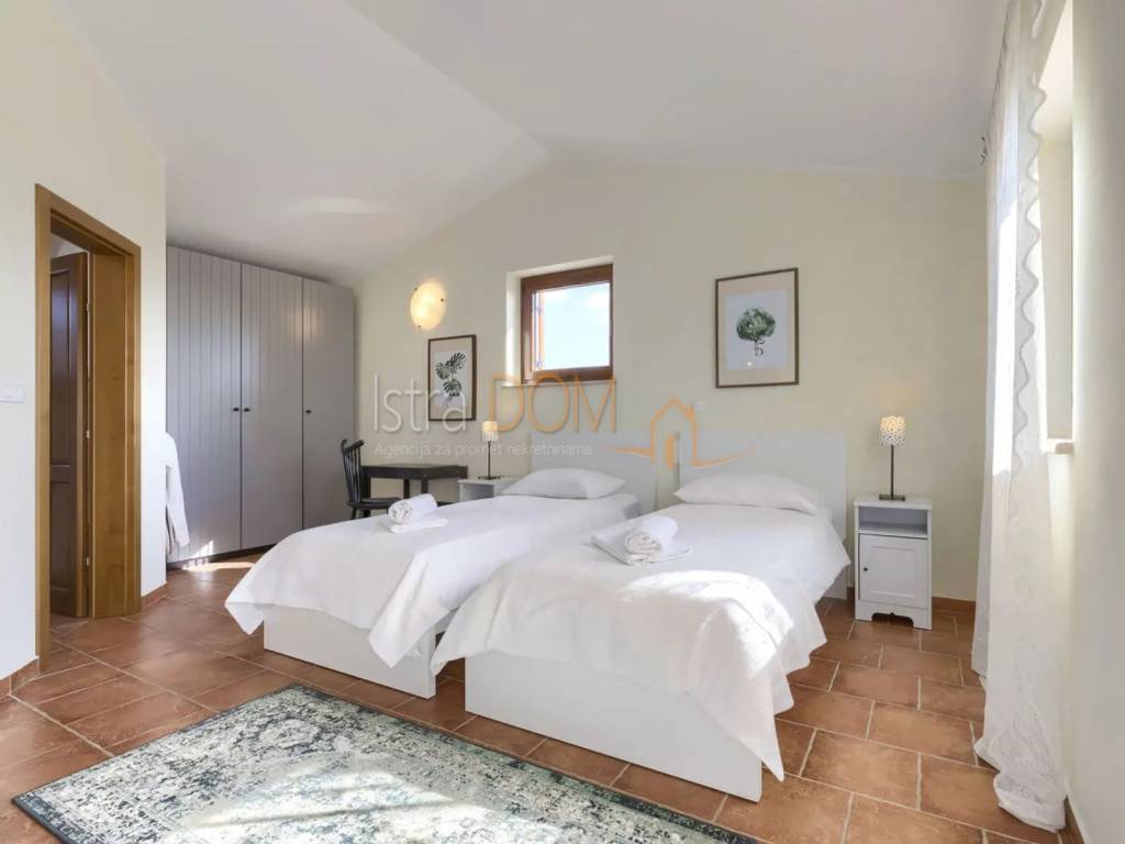 Vi presentiamo una splendida villa situata nel piccolo villaggio istriano di Čabrunići, immersa in un ampio giardino di 1527 m², delimitato da un muro a secco e circondato da rigogliosi giardini. Questa lussuosa proprietà di 226 m² è composta da un piano terra e un piano superiore, offrendo il perfetto connubio tra comfort, privacy e bellezza naturale.