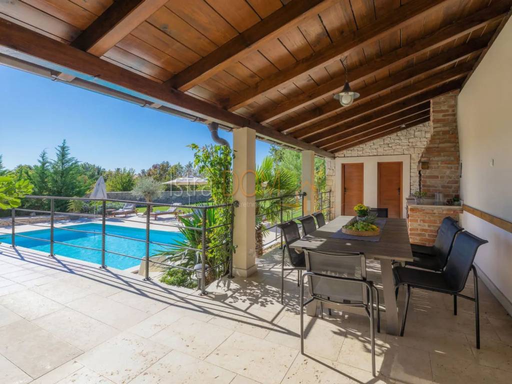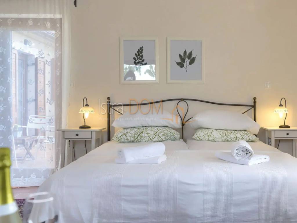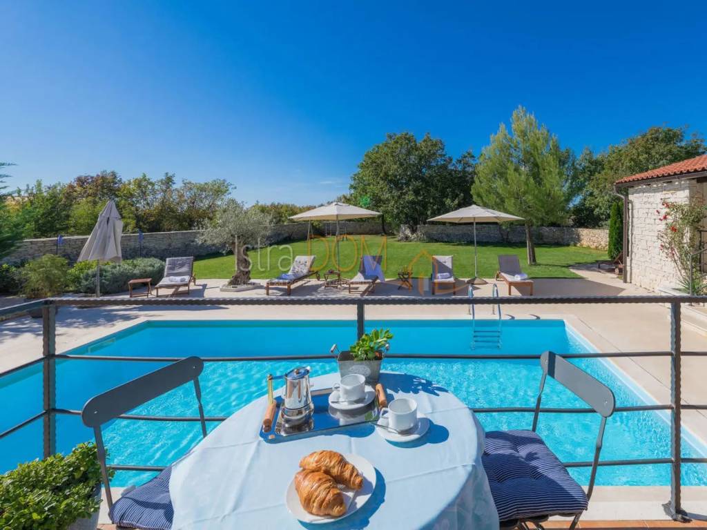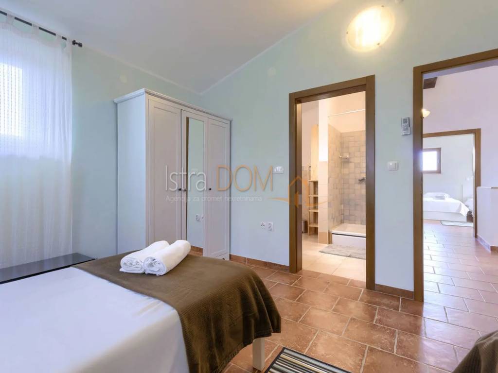 Vi presentiamo una splendida villa situata nel piccolo villaggio istriano di Čabrunići, immersa in un ampio giardino di 1527 m², delimitato da un muro a secco e circondato da rigogliosi giardini. Questa lussuosa proprietà di 226 m² è composta da un piano terra e un piano superiore, offrendo il perfetto connubio tra comfort, privacy e bellezza naturale.