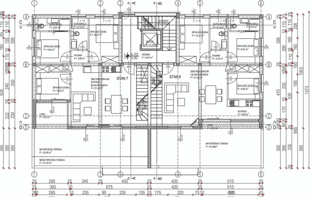 Apartment S-7 – 2nd floor – living area 69.13 m2 (3 bedrooms + 2 bathrooms) + loggia (6.55 m2) + covered terrace (25.45 m2) + uncovered terrace (10.18 m2) + rooftop terrace with pool (100 m2) + two outdoor parking spaces; net calculated area 137.02 m2 = 822,120 EUR (including VAT)