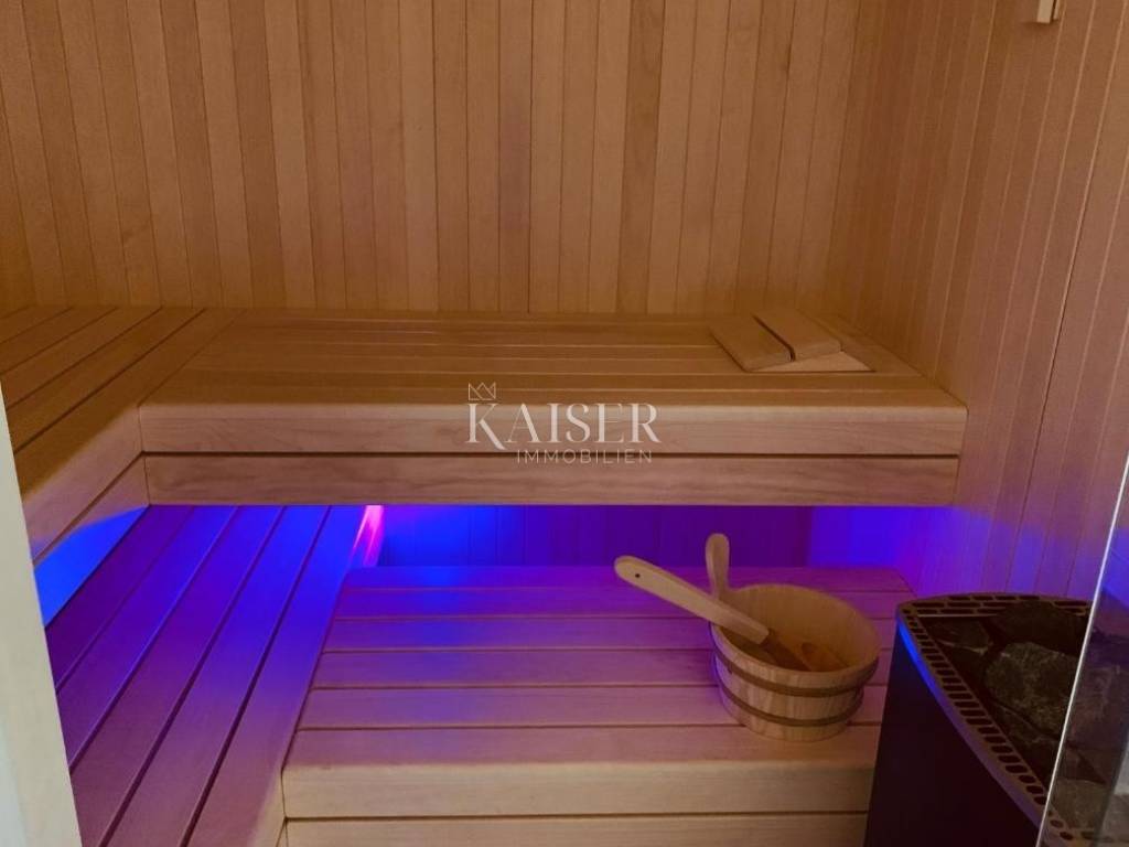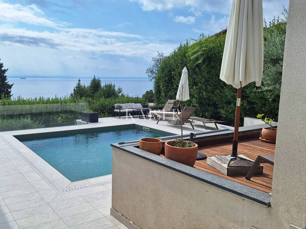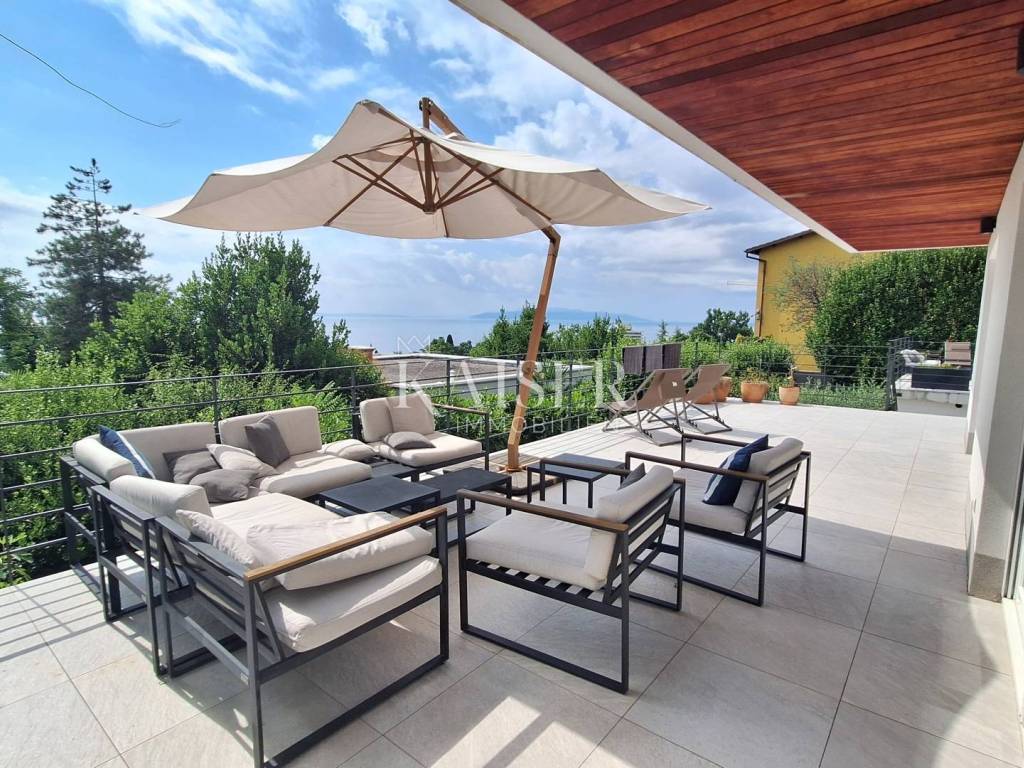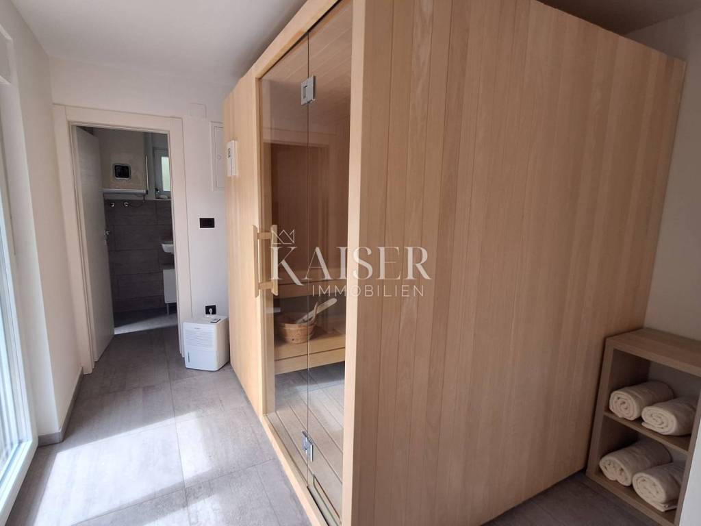 Nel seminterrato dell'edificio si trova una piccola oasi di relax con sedie a sdraio, una sauna finlandese e un bagno. Una scala esterna conduce al piano terra, che comprende: una cucina open space con zona pranzo e soggiorno, tutti con accesso a una terrazza esterna con vista sul mare e sul Quarnero, un piccolo disimpegno, una camera da letto con bagno e servizi igienici e un locale per la lavatrice.