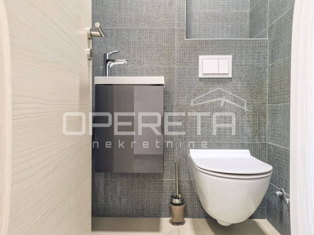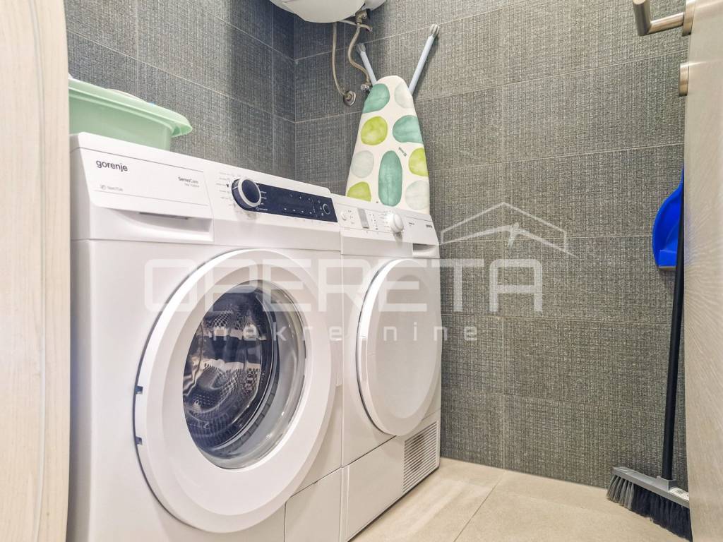 The interior is situated on the first floor of the western part of the building and has been thoughtfully designed for comfortable and luxurious living. It consists of an open and airy living room with a kitchen, two bedrooms, two bathrooms, a hallway, a toilet, a laundry room, and a covered balcony ideal for unwinding while enjoying the sea view.