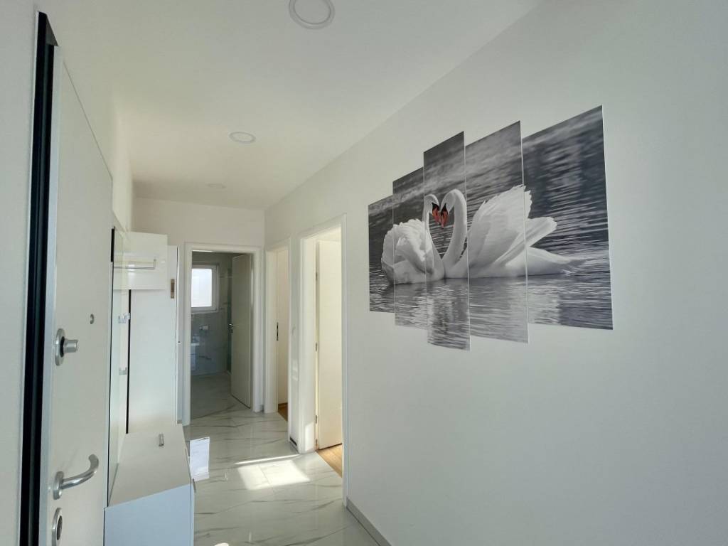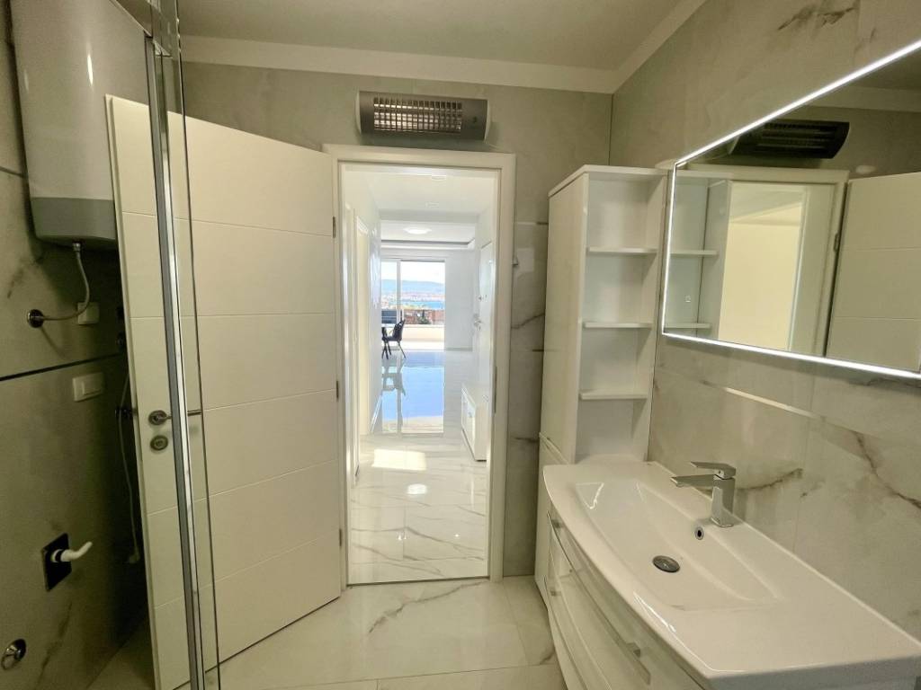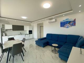 Lappartamento comprende un ingresso, due camere da letto, un bagno, una cucina con sala da pranzo e un soggiorno con accesso a una terrazza coperta di 18 m. La terrazza offre una vista panoramica sul mare. Lappartamento è completamente arredato, climatizzato, dotato di infissi esterni in PVC e porte blindate.