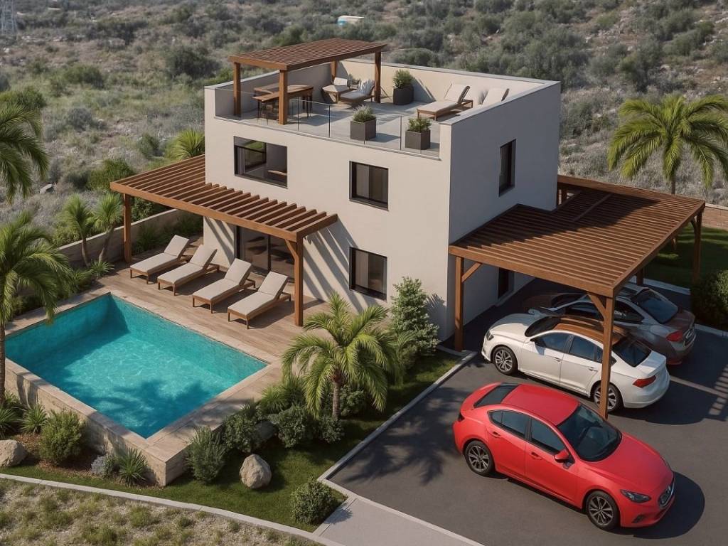 Al piano terra si trovano una camera da letto, un bagno, una cucina, una sala da pranzo e un soggiorno con accesso al cortile della casa, dove si trova una piscina con zona solarium. Una scala interna conduce al primo piano, dove si trovano tre camere da letto, ciascuna con il proprio bagno, e una camera ha accesso al proprio balcone con vista mare.