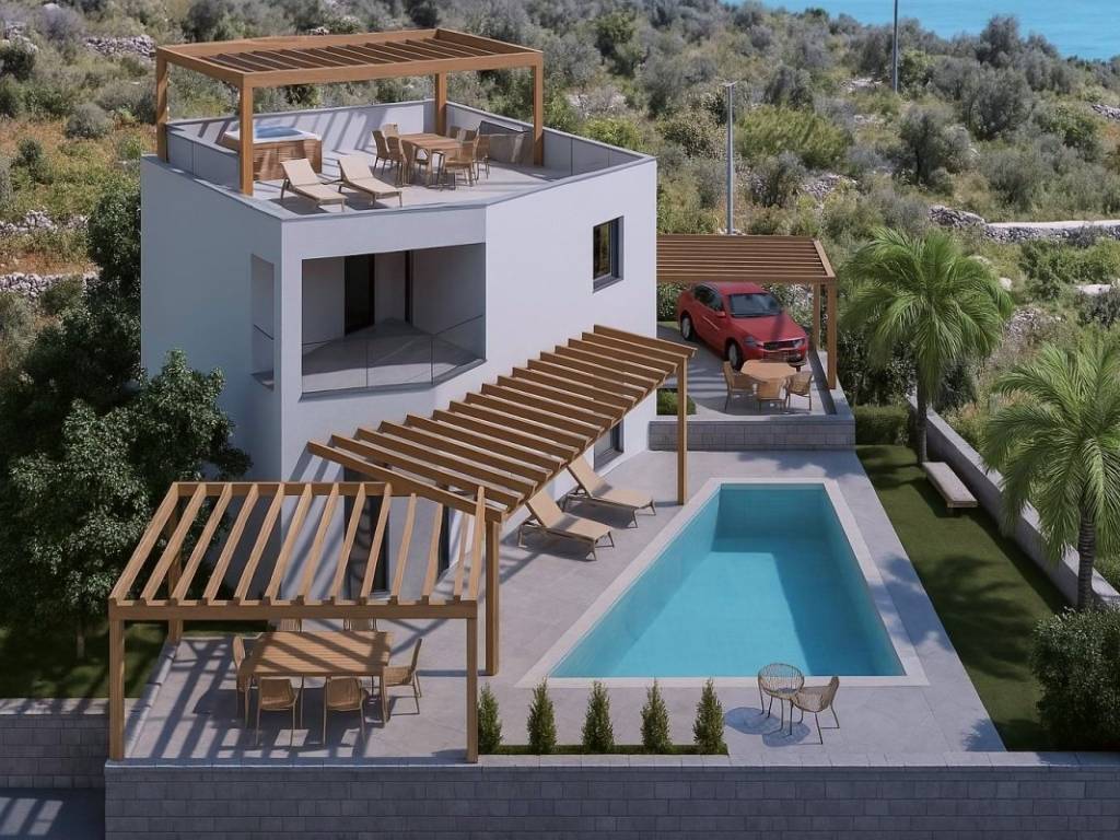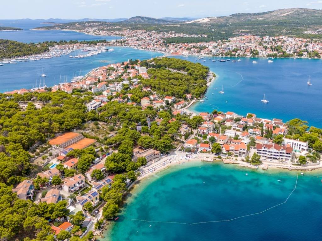 In una posizione eccellente, a Rogoznica, si trova una proprietà con un grande potenziale. Si trova su un terreno leggermente rialzato, il che è un vantaggio perché la proprietà ha una bellissima e libera vista sul mare.