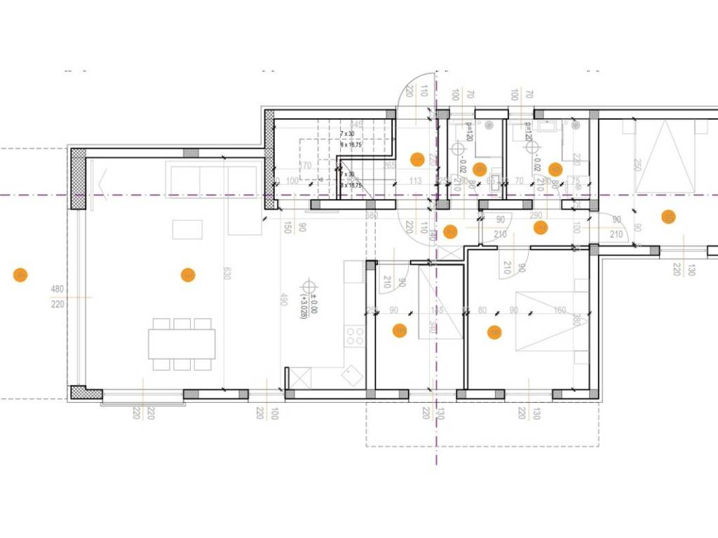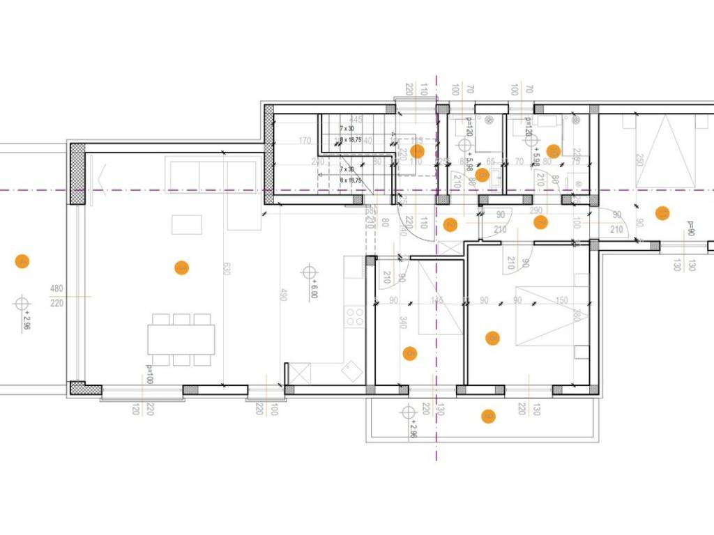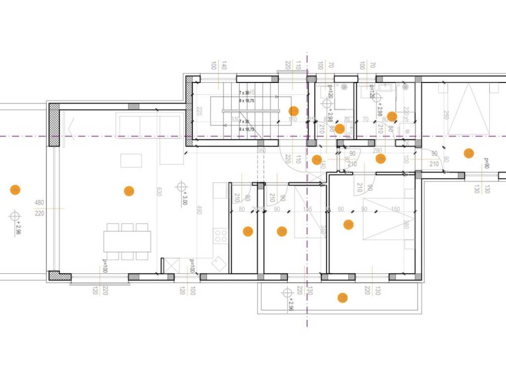 camera da letto 1 (8 m2), camera da letto 2 (12 m2), camera da letto 3 (12 m2), bagno 1 (3 m2), bagno 2 (5 m2), disimpegno 1 (4 m2), disimpegno 2 (3 m2), ripostiglio (4 m2), scala (10 m2), soggiorno con sala da pranzo e cucina (40 m2) e due balconi, il primo balcone è di 17 m2 e il secondo balcone è di 7 m2.