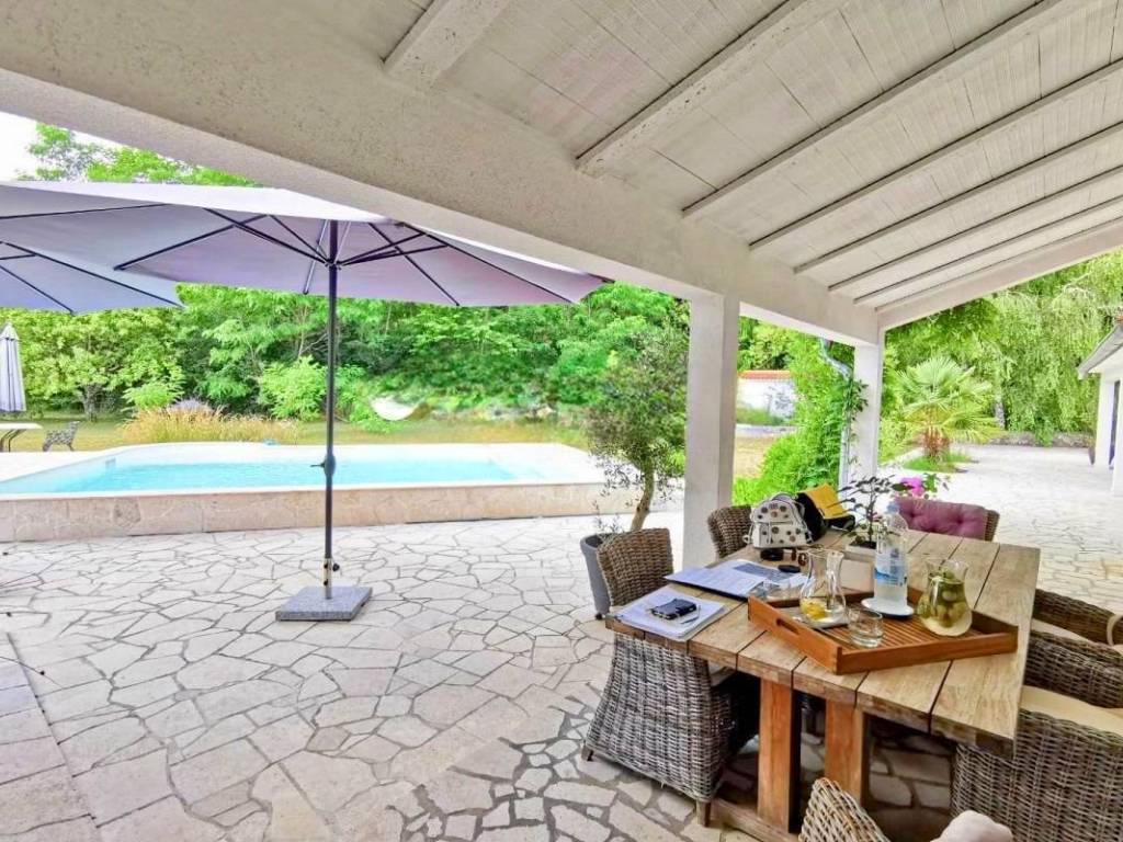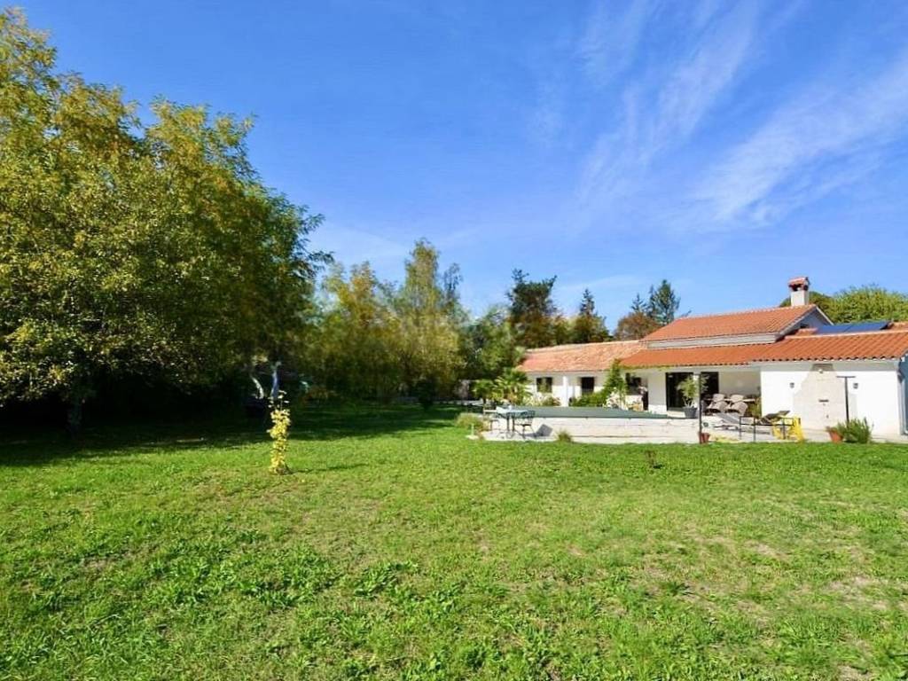 Vendesi casa in pietra a un piano, situata in una zona tranquilla nei pressi di Albona, su un ampio terreno di 1.947 m2 di superficie totale.