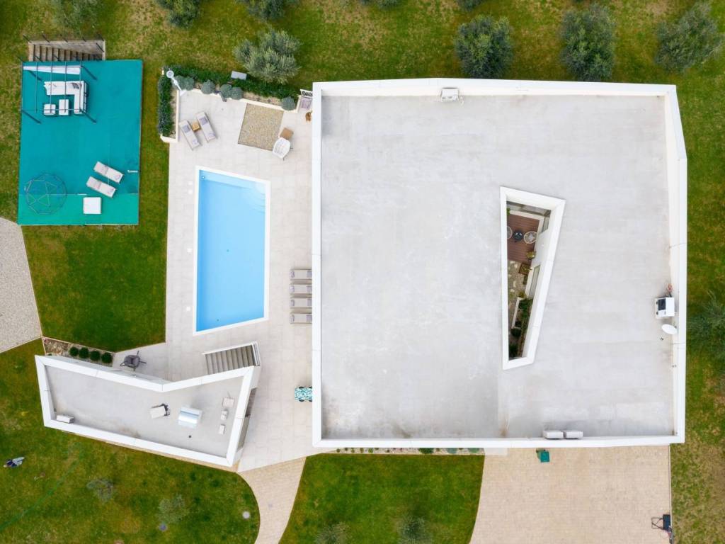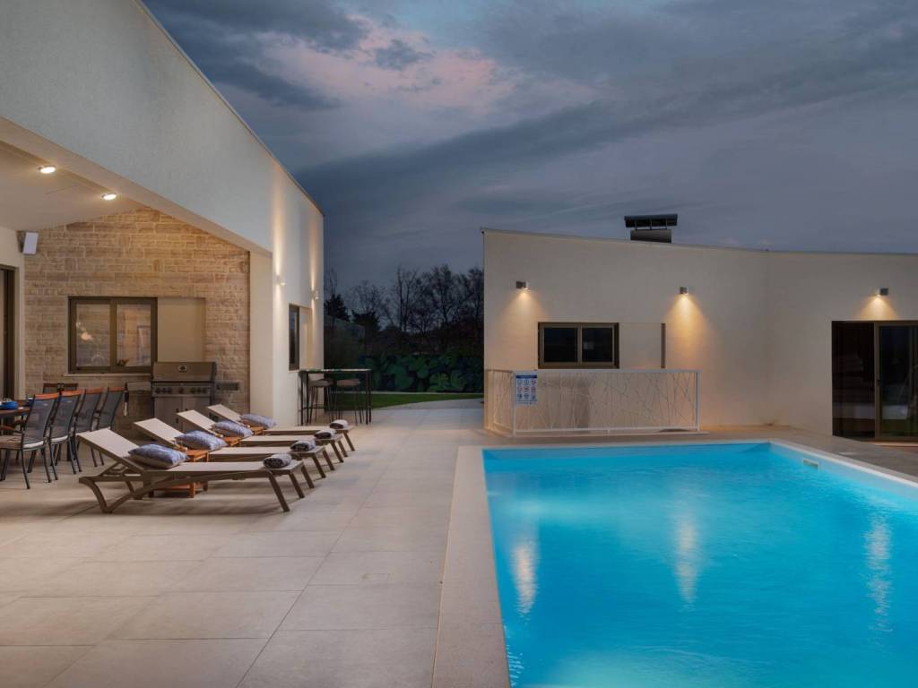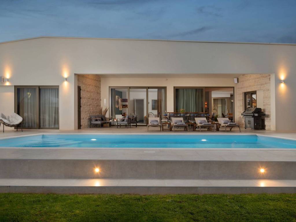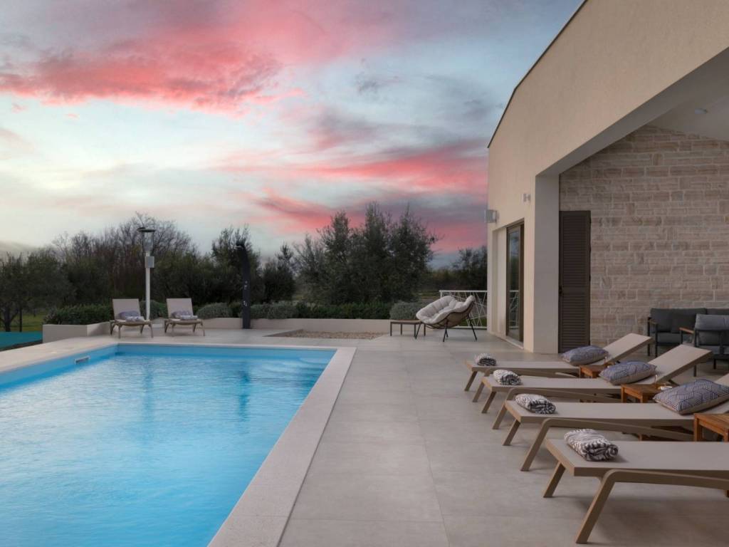 Casa moderna con piscina situata su un ampio terreno in un posto tranquillo a Zara. Sullampio terreno si trova una casa principale con edificio ausiliario. La casa principale è composta da cucina a vista con sala da pranzo e soggiorno, quattro camere da letto con bagni annessi, servizi igienici e lavanderia. Nella parte centrale della casa principale cè un giardino esterno con mobili, che lo rende il luogo perfetto per la pace e il relax. Nelledificio ausiliario si trovano una camera da letto, un bagno e un caminetto a legna. Dal soggiorno si accede alla terrazza coperta, che si arricchisce di una sala da pranzo allaperto e di una piscina (11 x 5 m) con zona prendisole. La proprietà dispone di riscaldamento a pavimento, impianto di irrigazione, telecamere, impianto audio e proiettore.