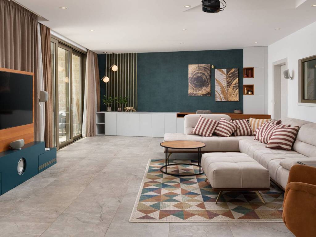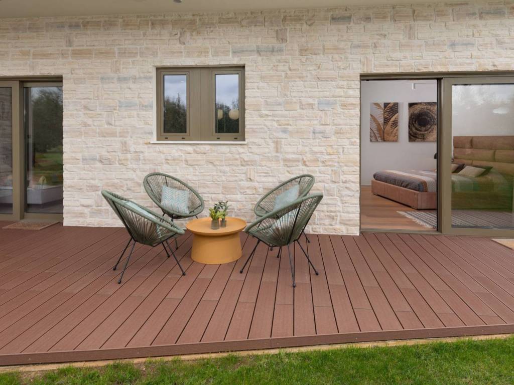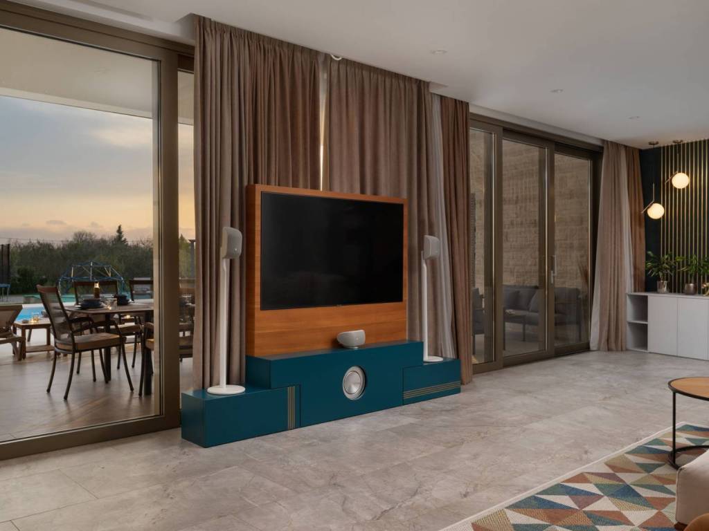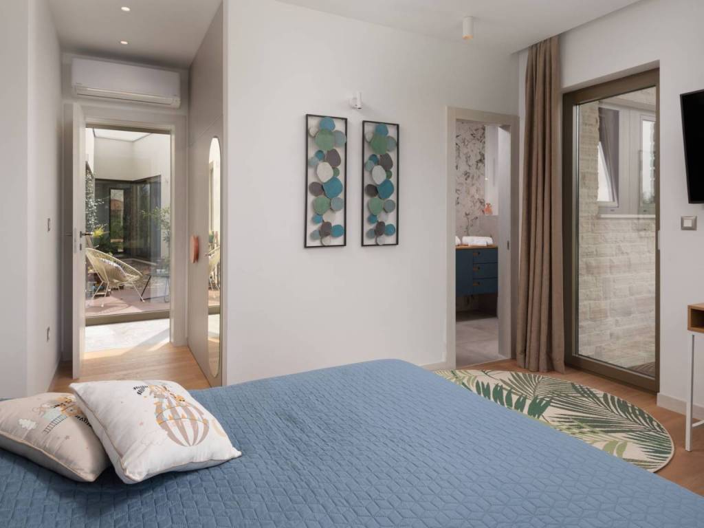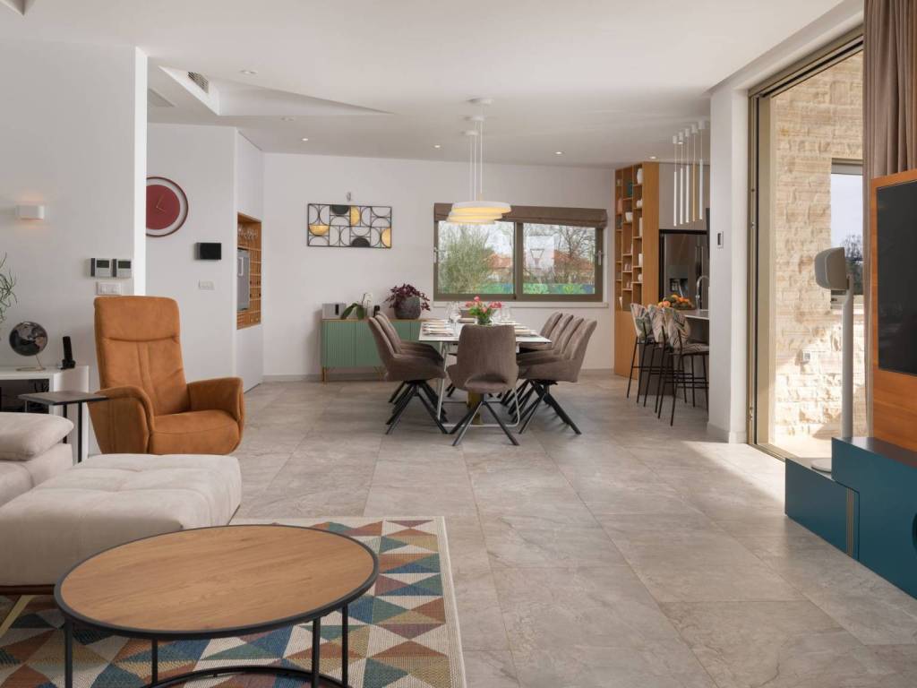 Casa moderna con piscina situata su un ampio terreno in un posto tranquillo a Zara. Sullampio terreno si trova una casa principale con edificio ausiliario. La casa principale è composta da cucina a vista con sala da pranzo e soggiorno, quattro camere da letto con bagni annessi, servizi igienici e lavanderia. Nella parte centrale della casa principale cè un giardino esterno con mobili, che lo rende il luogo perfetto per la pace e il relax. Nelledificio ausiliario si trovano una camera da letto, un bagno e un caminetto a legna. Dal soggiorno si accede alla terrazza coperta, che si arricchisce di una sala da pranzo allaperto e di una piscina (11 x 5 m) con zona prendisole. La proprietà dispone di riscaldamento a pavimento, impianto di irrigazione, telecamere, impianto audio e proiettore.