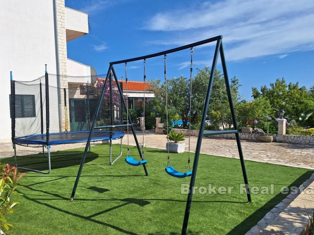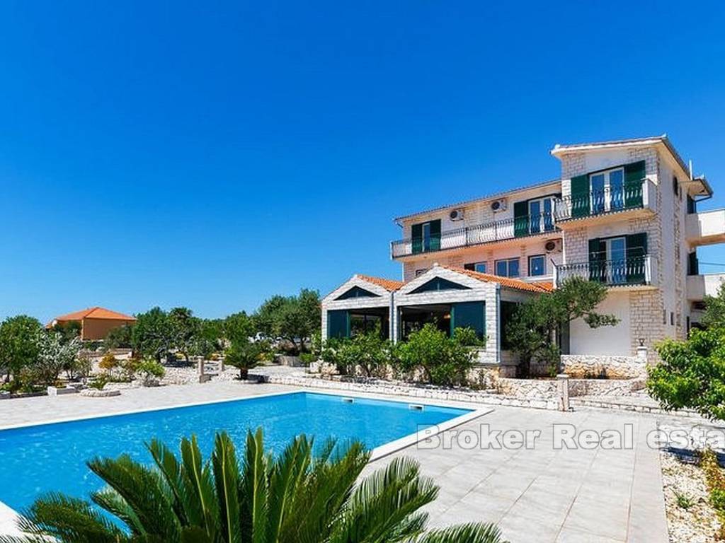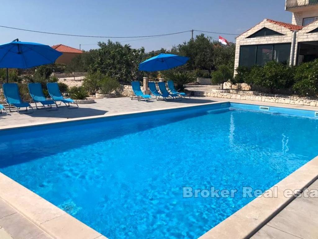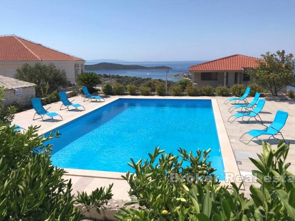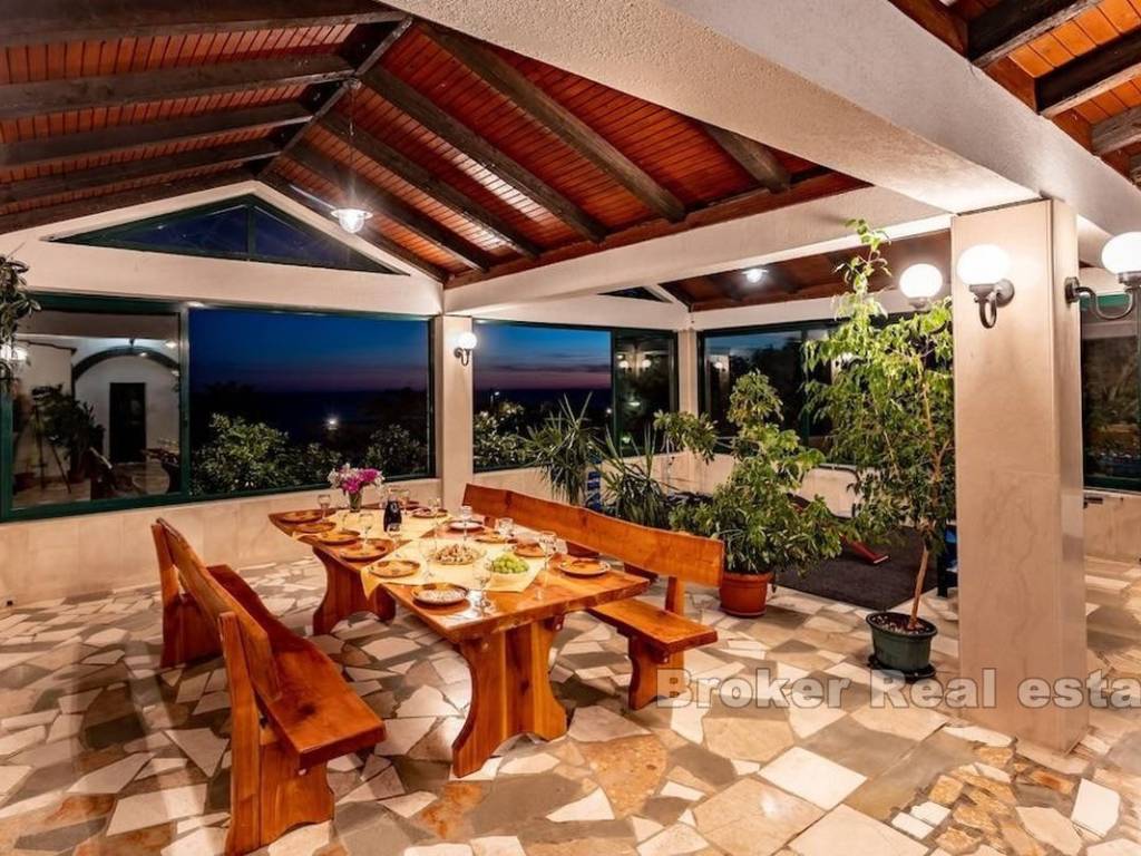 Casa su 3 piani con piscina e ristorante. Ha una meravigliosa vista panoramica sul mare. La superficie del terreno è di 3600 m2 e 600 m2 di superficie abitabile. Al piano terra si trova il ristorante. Al primo piano ci sono 4 camere da letto con 2 bagni e soggiorno. Il secondo piano ha 2 appartamenti. La piscina è di 126 metri sulla proprietà si trovano 80 ulivi e 60 alberi da frutto.