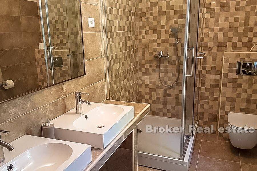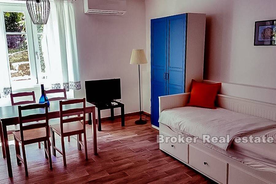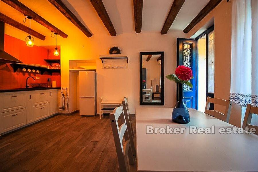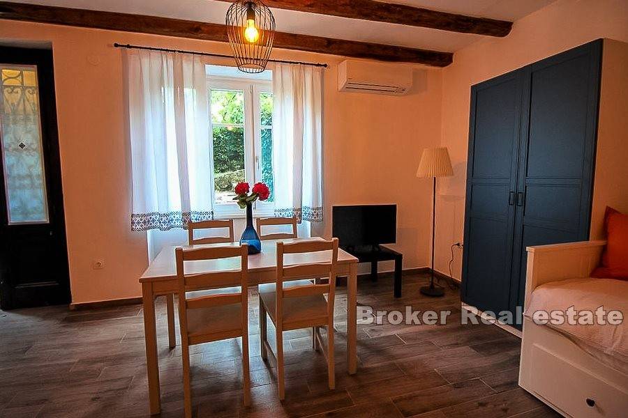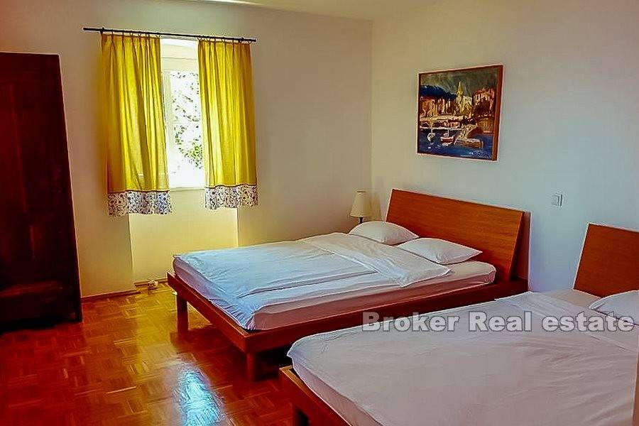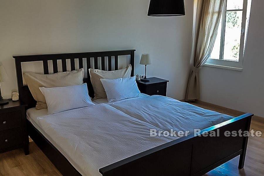 Una proprietà pittoresca situata in un tranquillo villaggio istriano vicino a Opatija. Si compone di una casa indipendente a due piani con una superficie abitabile di 200 m2 insieme a un terreno di 8144 m2. Al primo piano ci sono due monolocali con bagno. Ognuno è composto da una camera con quattro letti, cucina, tavolo da pranzo con sedie e un bagno separato. Inoltre, cè unaltra camera da letto separata con un bagno sul pavimento. Il secondo piano è composto da due monolocali. Il primo appartamento ha il layout descritto al primo piano, mentre il secondo appartamento ha due bagni. La casa è completamente arredata e mantenuta. È decorato in uno stile leggermente rustico, che unisce interessanti dettagli colorati, affascinanti elementi in legno e motivi in pietra. Trasmette unatmosfera pacifica e rilassante. Tutti i monolocali dispongono di aria condizionata. La superficie di 8144 m2 comprende un ampio giardino con vigneti paesaggistici e vegetazione mediterranea, che offre una splendida vista sul mare, situato a una distanza di 500 metri. Ha due terrazze coperte decorate con billette in legno, fiori e panche da giardino. Lintera esperienza della proprietà è completata da un pozzo e un fienile su due piani. Il primo è una taverna, mentre il secondo funge da magazzino per strumenti e macchine per il mantenimento della proprietà. La proprietà dispone di posti auto. Costruito allinizio del XX secolo, è stato rinnovato più volte dagli anni 90 e collegato al sistema di approvvigionamento idrico e fognario della città.
