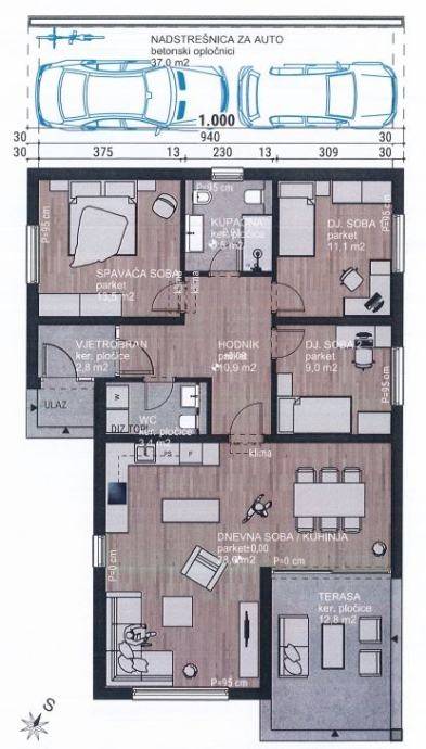 - ulazni pred prostor, hodnik, kuhinja / blagovaona / dnevni boravak, terasa, wc, kupaonica sa wc-om, tri spavaće sobe, natkriveni parkirni prostor