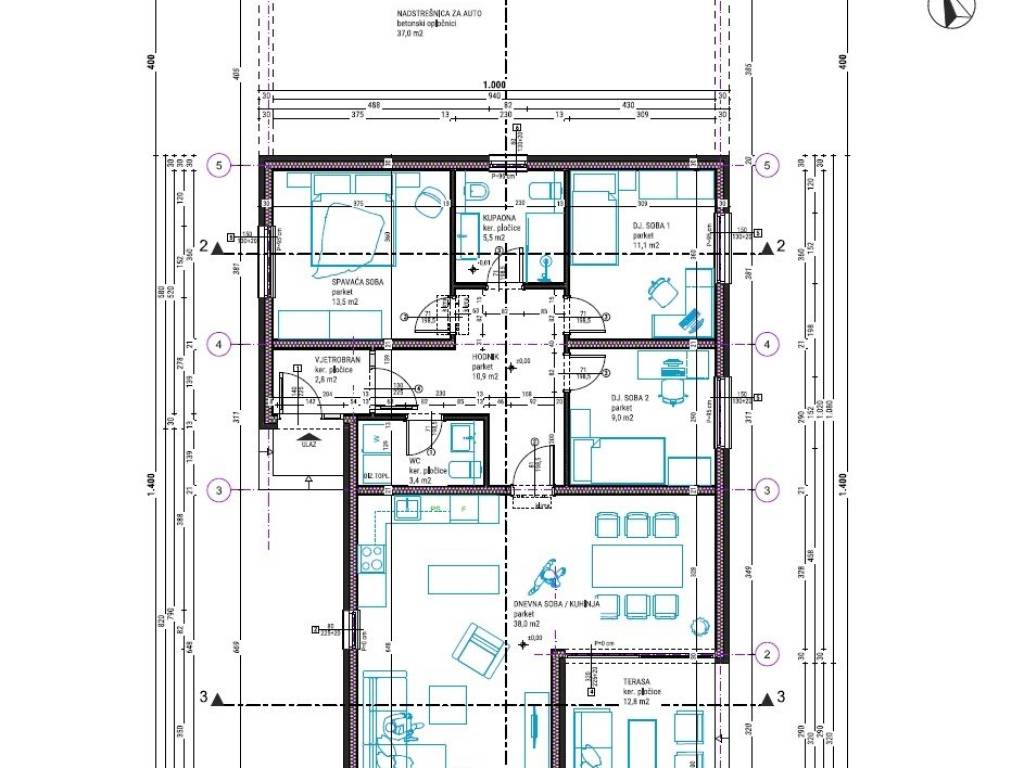 - ulazni pred prostor, hodnik, kuhinja / blagovaona / dnevni boravak, terasa, wc, kupaonica sa wc-om, tri spavaće sobe, natkriveni parkirni prostor