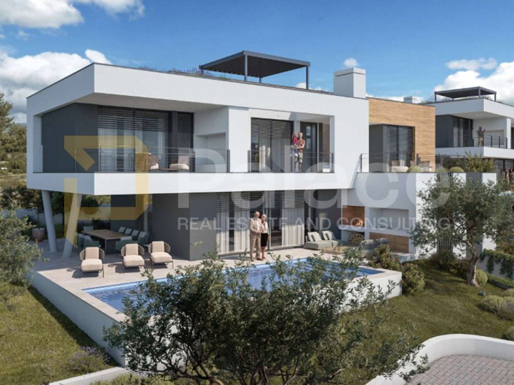 In Brodarica, one of the most desirable and beautiful tourist destinations near Šibenik, this exclusive villa D1 of top quality construction and modern design is located within the Bellevue 11 complex, which consists of ten luxury villas and one building. The location is ideal for both a peaceful family life and tourism rental nearby are a school, kindergarten, promenade, and beach.