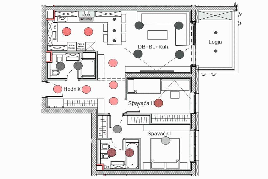 - entrance hallway - open-space living room with kitchen and dining area - access to the loggia - two bedrooms - two bathrooms (shower cabin + walk-in shower) ADDITIONAL FEATURES