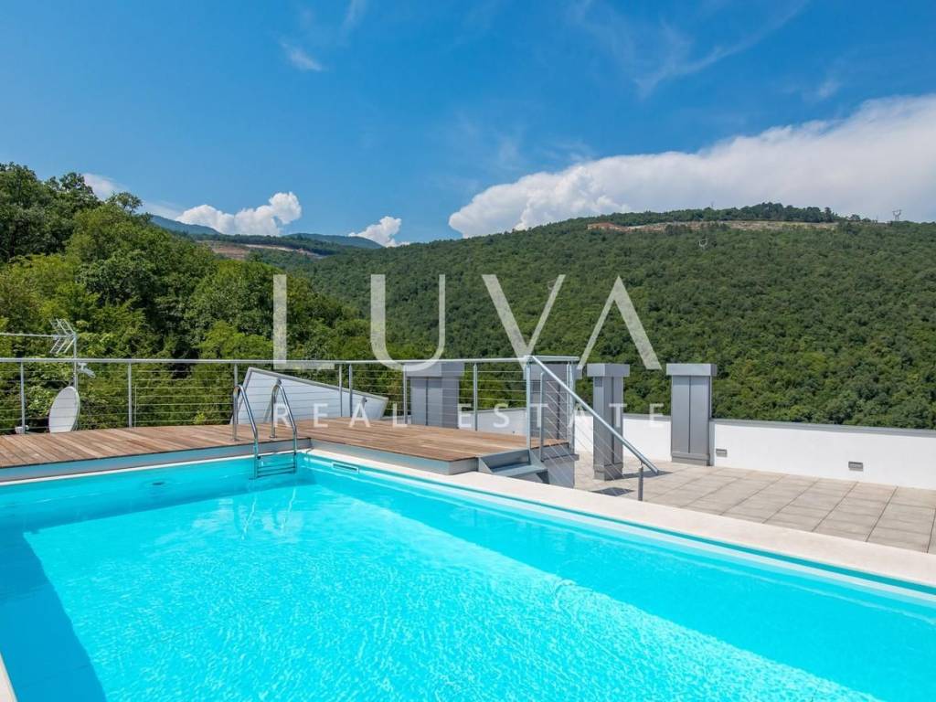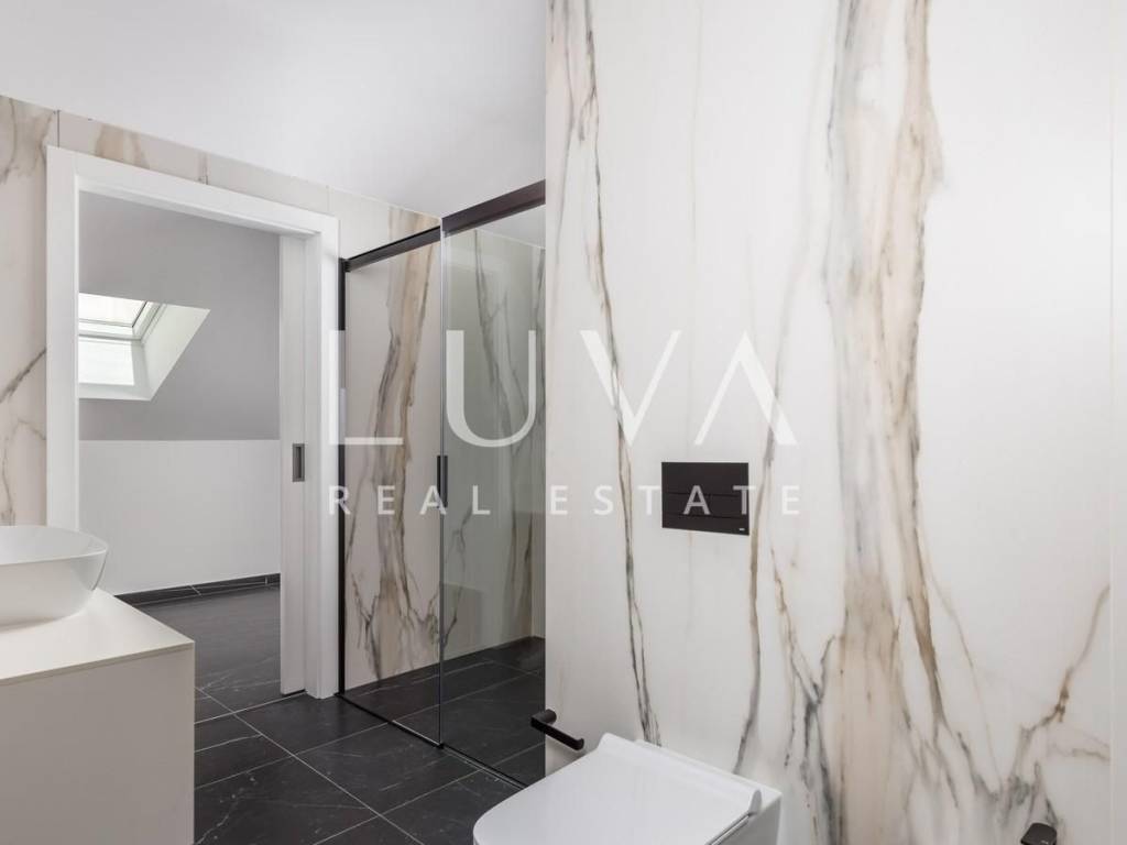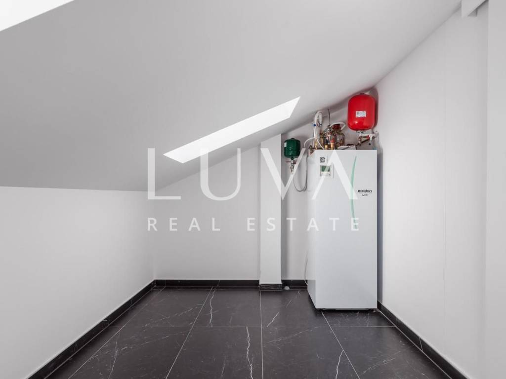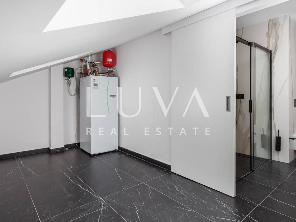 The penthouse features a large terrace and two balconies in the attic with a total area of 84.95 m², offering spectacular views of the sea and the surroundings of Opatija. The rooftop area of 227.23 m² provides complete privacy and a unique space for relaxation, sunbathing, or social gatherings outdoors.