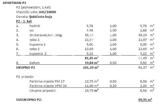 The apartment covers a total area of 99.95 m² (expressed with coefficients), while the gross area of the apartment is 101.29 m². The interior living space of 81.45 m² includes two bedrooms, two bathrooms, and an additional toilet. Every detail of the interior has been designed to provide maximum comfort and functionality, with plenty of natural light and high-quality finishing materials.