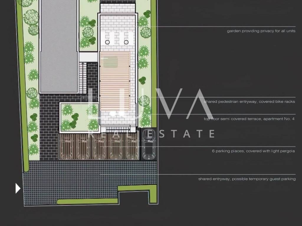 For parking, two covered parking spaces with pergolas are provided, and there are also bike storage facilities. A shared storage area for all property owners is also planned.
