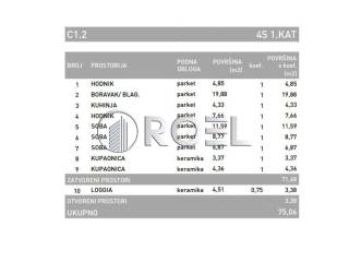 Three-bedroom apartment with a total area of 75.06 m m, located in the Dubrava district of Zagreb. Available on the first, second and third floors and on the ground floor of a building with a total of 6 floors. It consists of an entrance hall, living room with kitchen and dining room, two bedrooms, one with a large built-in wardrobe, two bathrooms with toilet and a loggia. It is oriented to the south, north and east.