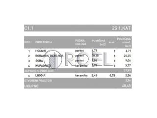 Two-bedroom apartment with a total area of 40.40 m, located in the Dubrava district of Zagreb. It is located on the first and third floors of a 6-story building. It consists of an entrance hall, living room with kitchen and dining room, one bedroom, bathroom with toilet and a loggia. Oriented to the north.