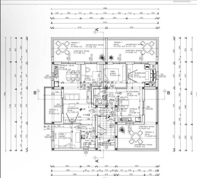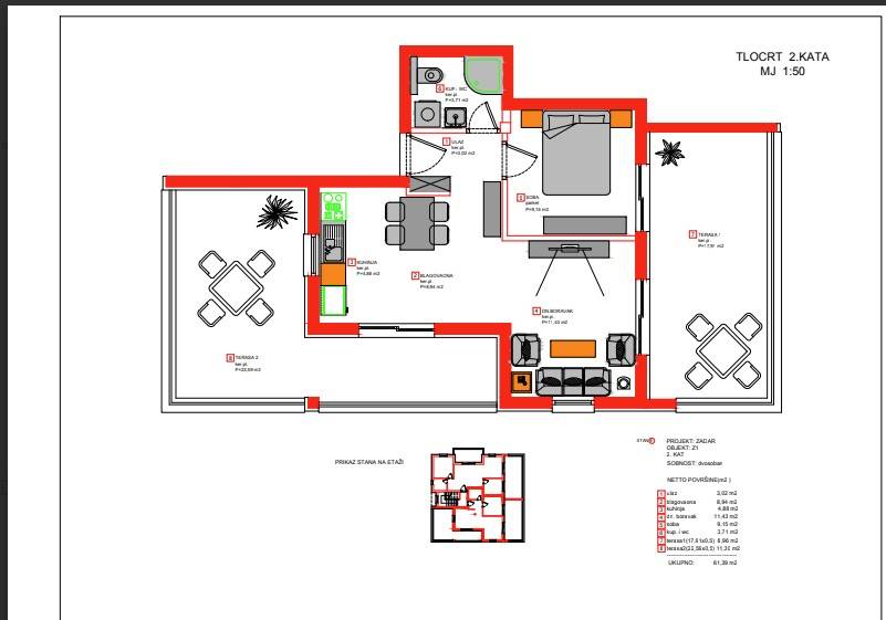 Prodaje se jednosoban stan oznake S9 na 2. katu zgrade, novogradnja. Zgrada se sastoji od prizemlja i dva kata, ukupno 9 stambenih jedinica. Stan oznake S9 se sastoji od ulaza, kuhinje, blagavaone, dnevnog boravka, jedne spavaće sobe i kupaone s wc-om te dvije velike terase od 17,9 i 22,59 m2 (tlocrt u privitku). Stanu S9 pripada ostava oznake S6 površine 9,80 m2, prema koef. 0,5 ulazi u kvadraturu etažne jedinice sa 4,9 m2, te parkirno mjesto 2,75 m2. Etažna jedinica stana S9 će imati ima ukupno 69,04 m2 . Podno grijanje u cijelom stanu , klima, PVC stolarija s komarnicima, električne rolete, prema želji kupca parketi i keramika. Planiran završetak i useljenje je ljeto 2026. godine. Jako lijepa mirna lokacija, blizina svih sadržaja, kao i blizina plaže, idealno za život tokom cijele godine kao i za korištenje u apartmanske svrhe.