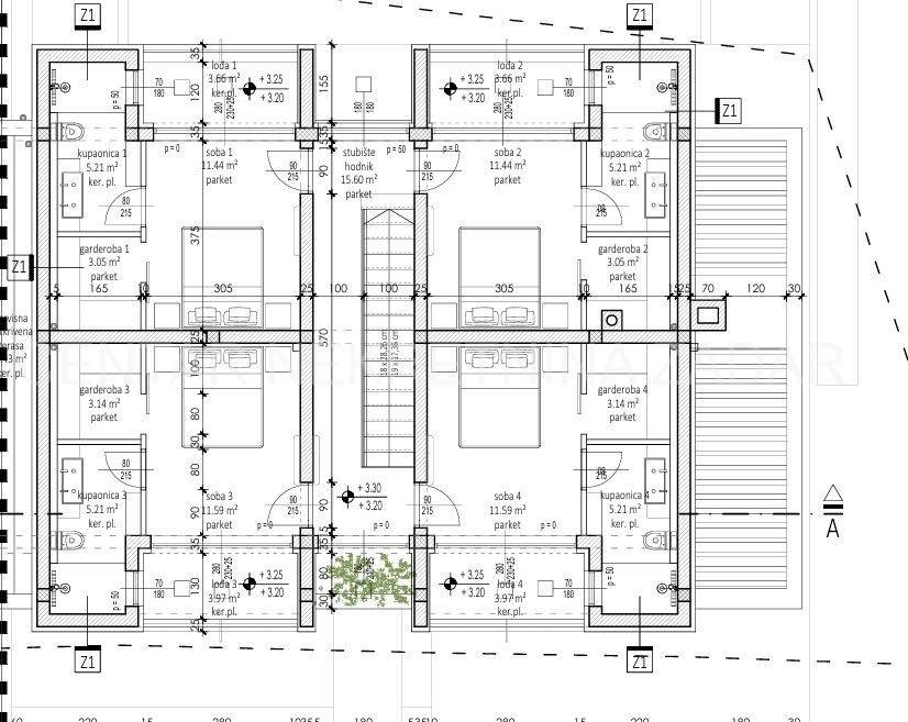 On the ground floor there are a kitchen with a dining room and a living room (42 m), a gym with a wellness area, a toilet, a boiler room/laundry room, a storage room and two terraces (24 m). An internal staircase leads to the first floor where there are four spacious bedrooms (11,5 m) with wardrobes and large bathrooms.