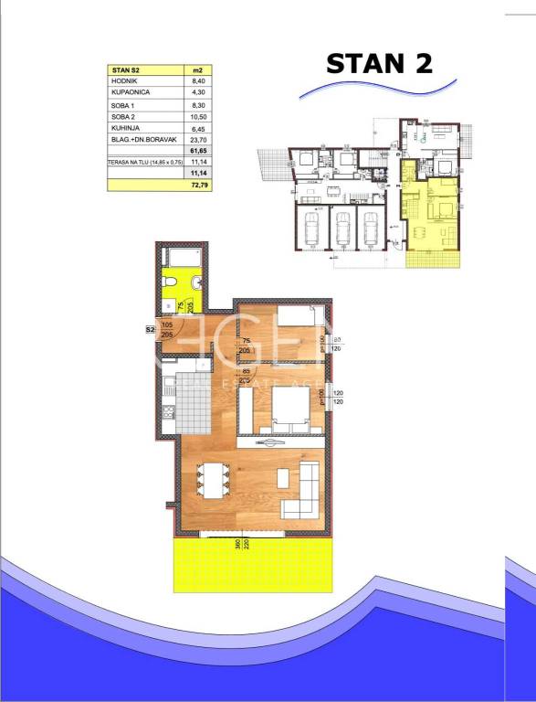 Appartamento al piano terra di un piccolo edificio a Drvenik, situato a soli 50 metri dal mare. Si trova in una nuova costruzione che sarà abitabile tra due mesi e rappresenta un'ottima scelta per vacanze, affitto turistico o una vita tranquilla in riva al mare. L'appartamento ha una superficie netta totale di 75 m², ed è composto da soggiorno con sala da pranzo e cucina, due camere da letto, corridoio, bagno, un bagno aggiuntivo e ripostiglio. Dal soggiorno si accede alla terrazza al piano terra di 15 m², che offre ulteriore spazio per godersi l'aria aperta. In ogni stanza è installato un condizionatore, mentre il bagno è dotato di riscaldamento a pavimento. Il posto auto è assicurato di fronte all'edificio, il che facilita ulteriormente l'uso quotidiano della proprietà. La proprietà si trova in una zona tranquilla di Drvenik, un piccolo villaggio costiero famoso per il mare pulito e le spiagge curate. Il mare dista solo 50 metri, e la spiaggia e i servizi di base sono raggiungibili in pochi minuti di una piacevole passeggiata. L'edificio è in fase di completamento, e l'insediamento è previsto tra due mesi. Per maggiori informazioni o per organizzare una visita, non esitate a contattarci.