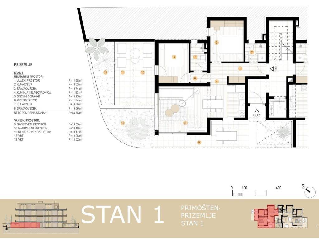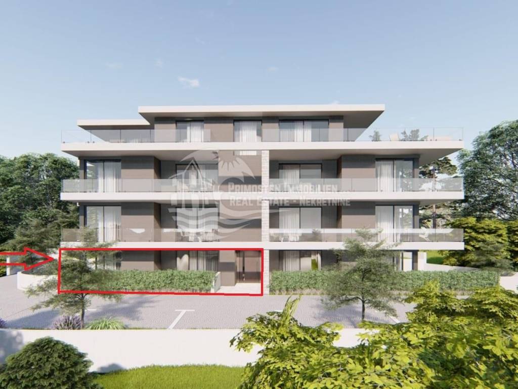 Unit S1 (Ground Floor) – living area 82.26 m², two covered terraces (23.73 m²), open terrace (9.17 m²), small garden (13.02 m²): This 3-bedroom apartment is in a modern building with seven units, just a few steps from the sea and about a five-minute drive from Primošten town center. It features a spacious living room with kitchen and dining area, two bedrooms, two bathrooms, and an entrance hall. Two covered terraces, an open terrace, and a small garden provide stunning, unobstructed sea views. Equipped with underfloor heating, aluminum windows with integrated mosquito screens, electric shutters, three air conditioning units, high-quality Italian ceramic tiles, Grohe sanitary fittings, and Geberit flush plates. Elevator and parking included. Ready for occupancy spring 2027.