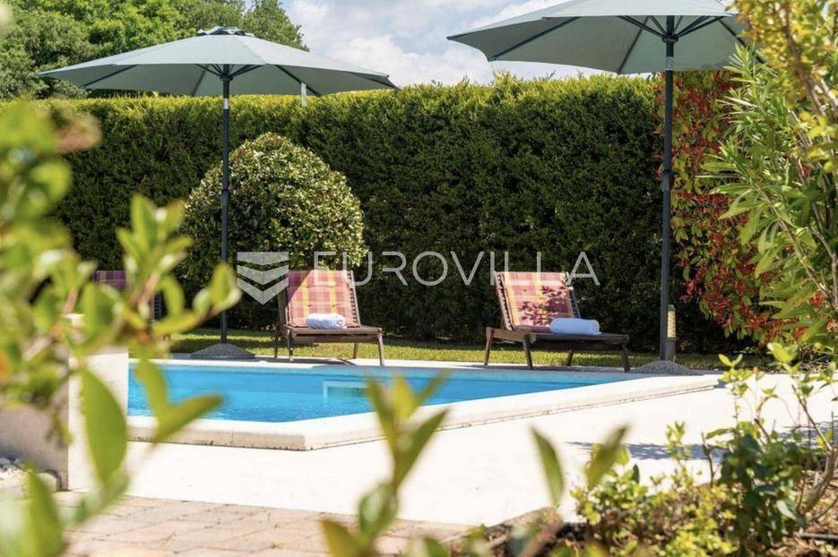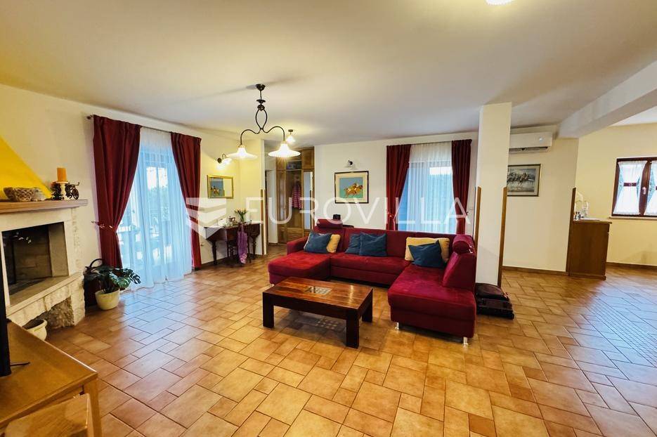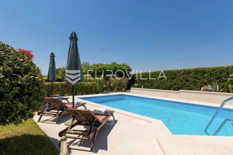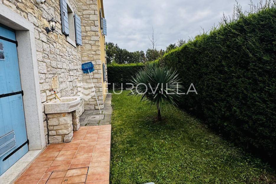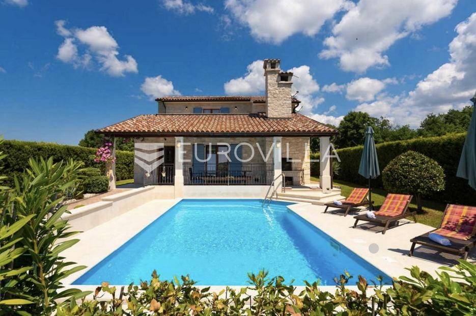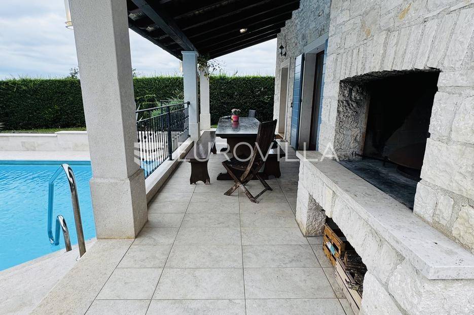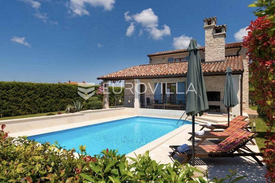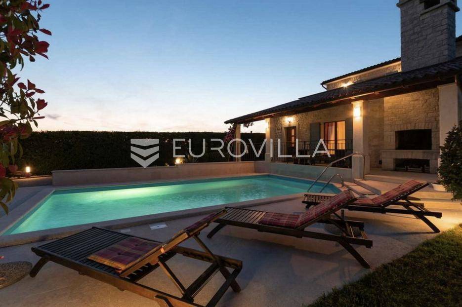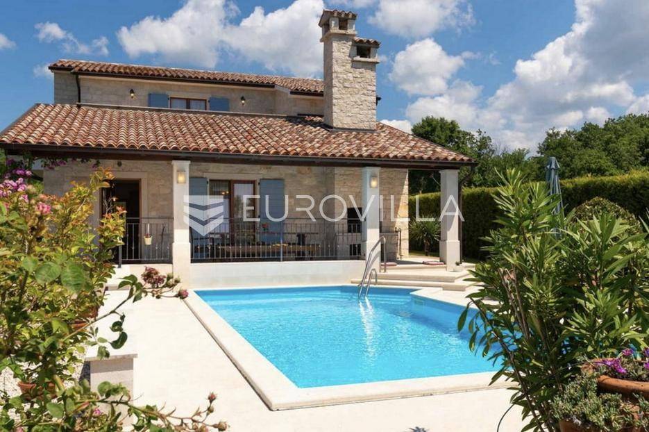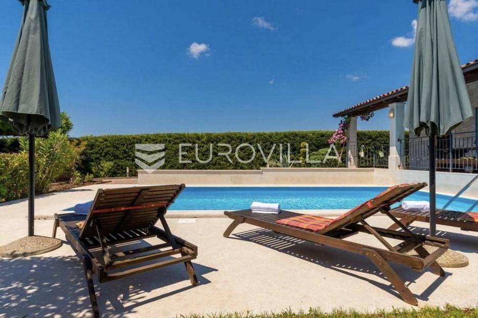 Istra, Tinjan, šarmantna samostojeća villa u srcu Istre.Svega 15-ak kilometara od grada Poreča smjestila se prekrasna villa. Izgrađena je 2010. godine, kuća je građena u izvornom istarskom stilu kombinacijom modernih i tradicionalnih materijala na okućnici od cca 800 m2.U prizemlju ville nalazi se opremljena kuhinja s blagovaonicom, prostrani dnevni boravak s tradicionalnim kaminom, toalet za goste, spavaća soba s vlastitom kupaonicom i spremište ispod stepeništa. Na prvi kat vodi nas betonsko stepenište popločano prekrasnim drvenim oblogama. Tu su se smjestile dvije prostrane spavaće sobe s vlastitim kupaonicama koje povezuje hodnik koji ima izlaz na nenatkrivenu terasu s koje se pruža prekrasan pogled na more.Kuća se grije s pomoću plinskog podnog grijanja i kamina a hladi s pomoću klima uređaja.Na velikoj okućnici smjestio se bazen od cca 25 m2, plaža, vanjski tuš, natkrivena terasa s kaminom za uživanje s obitelji i prijateljima. Na bočnoj strani kuće nalazi se i kotlovnica.Hortikultura je prekrasno održavana, cijeli teren okružuje visoka prekrasna lovor višnja, travnjaci, navodnjavanje cijelog vrta i električni portun od kovanog željeza uz koji su se smjestila dva parkirna mjesta.Kuća se prodaje namještena.Ako želite ovu intimnu oazu za sebe slobodno nas kontaktirajte, stojimo Vam na raspolaganju za sva dodatna pitanja.... Više na eurovilla.hr, ID: 115578