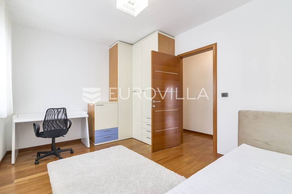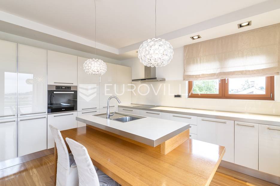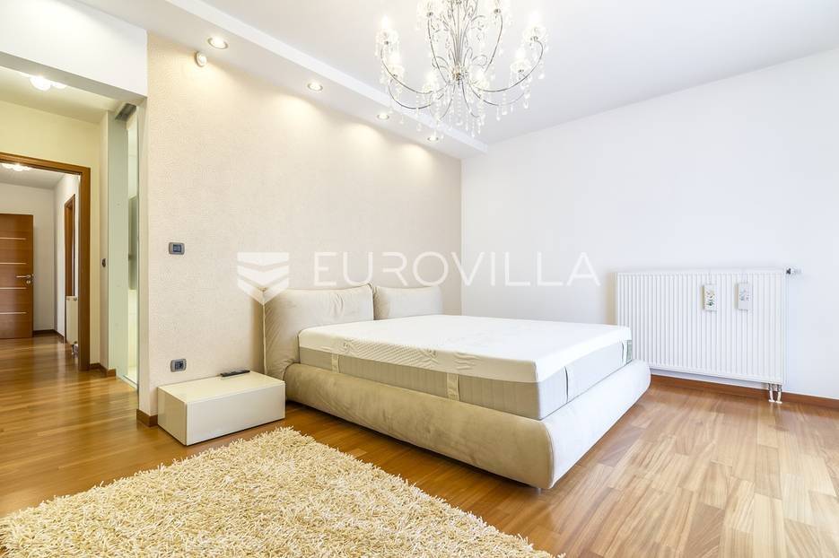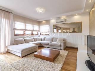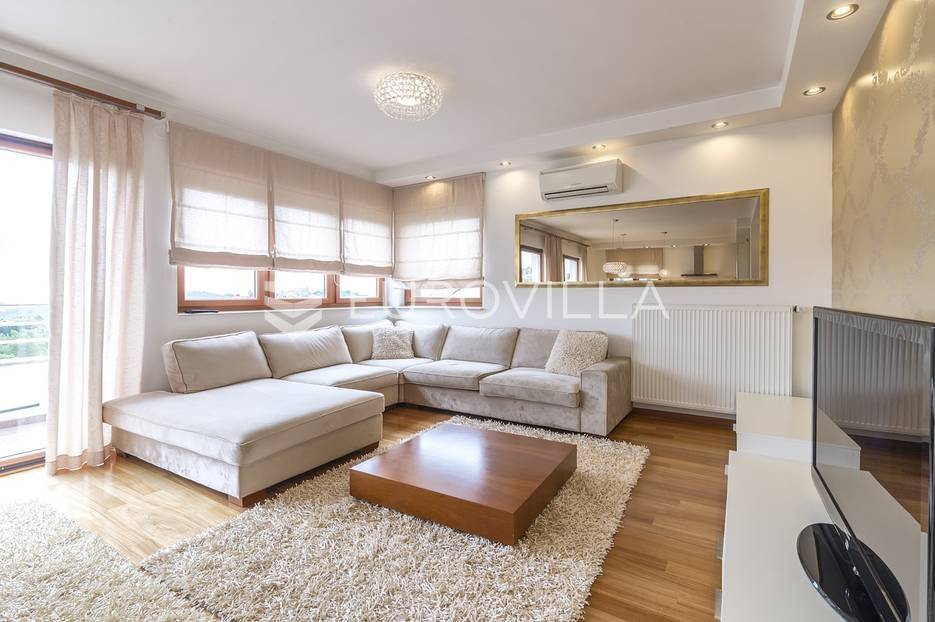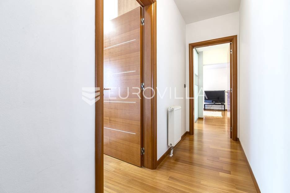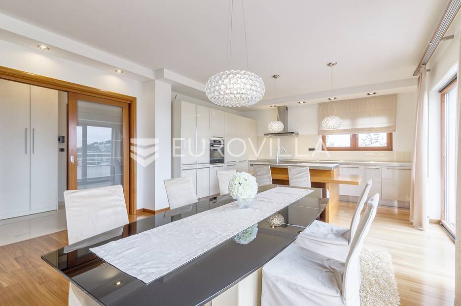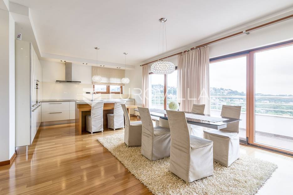 Šestine, prekrasan četverosoban stan zatvorene površine 124 m2. Sastoji se od hodnika, 2 kupaonice, 3 spavaće sobe, dnevnog boravka, kuhinje, blagovaonice, 2 loggie i balkona. Pripada mu vanjsko parkirno mjesto i garaža, ukupno 140 m2. Gradnja prema visokim standardima. Doussie egzota parket, brački kamen, klimatiziran, drvo aluminij stolarija, protuprovalna vrata. Sunčana orijentacija. Prekrasan pogled na zelenilo i grad, potpuna privatnost. Termo-izo fasada, ravni krov sa hidroizolacijom, energetski certifikat B. Blizina javnog prijevoza, Britanske škole i svih bitnijih sadržaja. Ostale informacije na upit.... Više na eurovilla.hr, ID: 298181