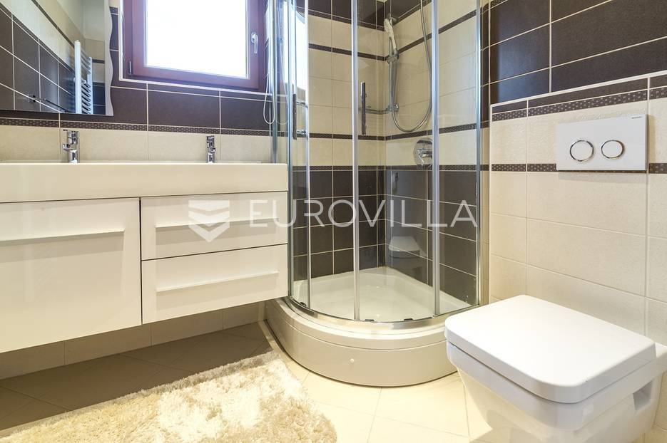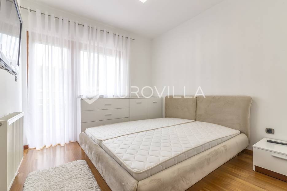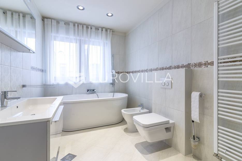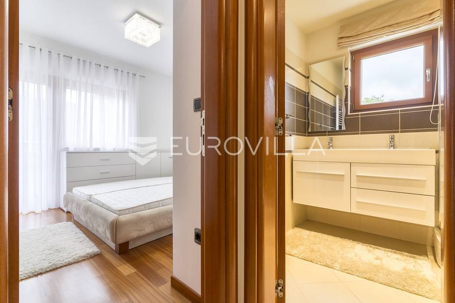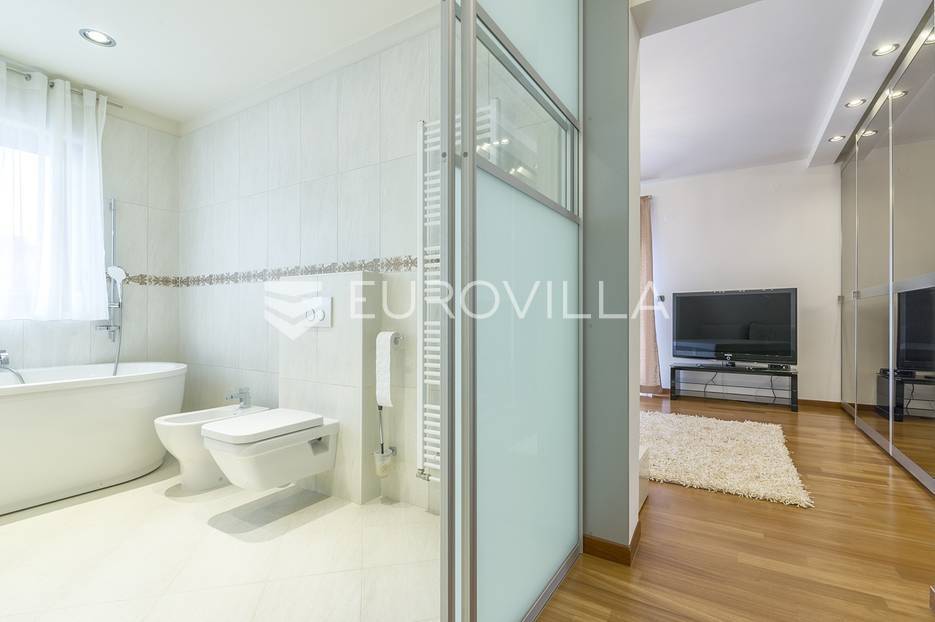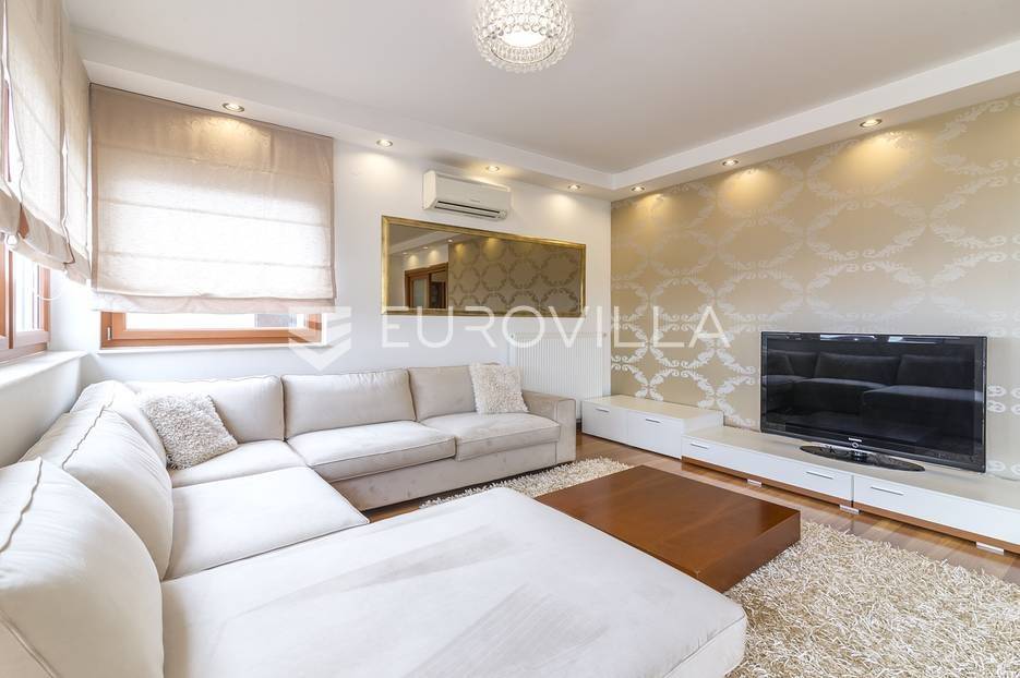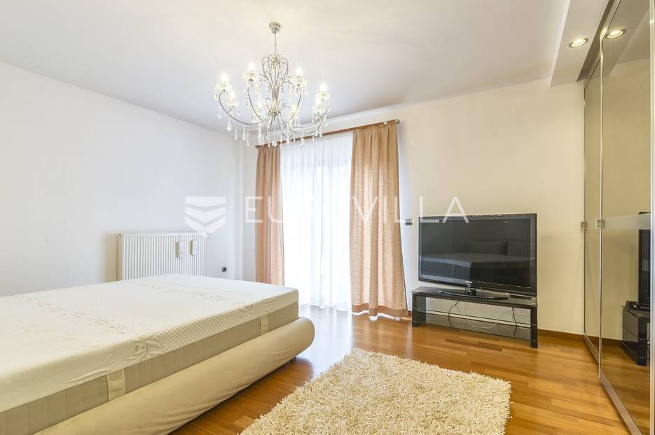 Šestine, prekrasan četverosoban stan zatvorene površine 124 m2. Sastoji se od hodnika, 2 kupaonice, 3 spavaće sobe, dnevnog boravka, kuhinje, blagovaonice, 2 loggie i balkona. Pripada mu vanjsko parkirno mjesto i garaža, ukupno 140 m2. Gradnja prema visokim standardima. Doussie egzota parket, brački kamen, klimatiziran, drvo aluminij stolarija, protuprovalna vrata. Sunčana orijentacija. Prekrasan pogled na zelenilo i grad, potpuna privatnost. Termo-izo fasada, ravni krov sa hidroizolacijom, energetski certifikat B. Blizina javnog prijevoza, Britanske škole i svih bitnijih sadržaja. Ostale informacije na upit.... Više na eurovilla.hr, ID: 298181